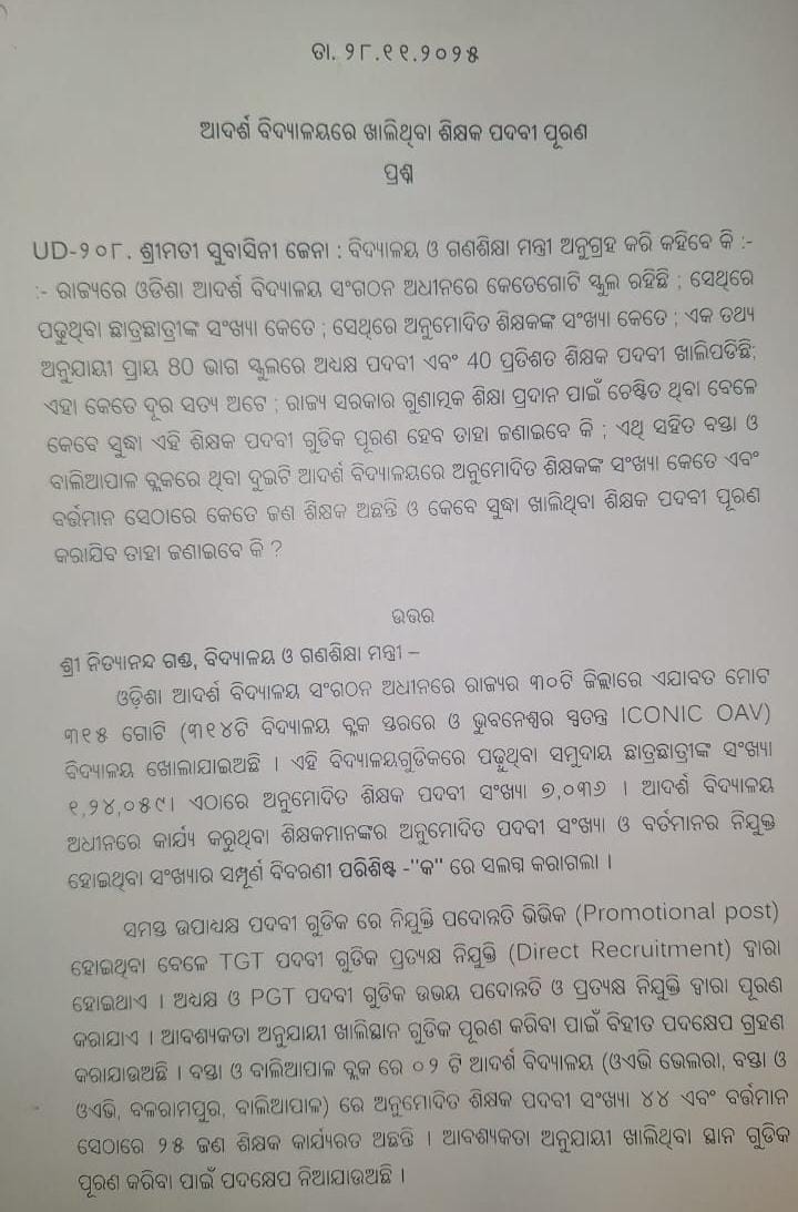 ରାଜ୍ୟରେ ୩୧୫ଟି ଆଦର୍ଶ ବିଦ୍ୟାଳୟରେ ଖାଲି ପଡ଼ିଛି ୨୪୬୭ଟି ଶିକ୍ଷକ ପଦବୀ । ଏ ନେଇ ସୂଚନା ଦେଇଛନ୍ତି ବିଦ୍ୟାଳୟ ଓ ଗଣଶିକ୍ଷା ମନ୍ତ୍ରୀ ନିତ୍ୟାନନ୍ଦ ଗଣ୍ଡ । ଆଜି ଗୃହରେ ବିଧାୟିକା ସୁବାସିନୀ ଜେନା ପ୍ରଶ୍ନ କରିଥିଲେ ଯେ ରାଜ୍ୟରେ ଓଡିଶା ଆଦର୍ଶ ବିଦ୍ୟାଳୟ ସଂଗଠନ ଅଧୀନରେ କେତେଗୋଟି ସ୍କୁଲ ରହିଛି | ସେଥିରେ ପଢୁଥିବା ଛାତ୍ରଛାତ୍ରୀଙ୍କ ସଂଖ୍ୟା କେତେ? ସେଥିରେ ଅନୁମୋଦିତ ଶିକ୍ଷକଙ୍କ ସଂଖ୍ୟା କେତେ ? ଏକ ତଥ୍ୟ ଅନୁଯାୟୀ ପ୍ରାୟ ୮୦ ଭାଗ ସ୍କୁଲରେ ଅଧ୍ୟକ୍ଷ ପଦବୀ ଏବଂ ୪୦ ପ୍ରତିଶତ ଶିକ୍ଷକ ପଦବୀ ଖାଲିପଡିଛି ଏହା କେତେ ଦୂର ସତ୍ୟ ଅଟେ । ରାଜ୍ୟ ସରକାର ଗୁଣାତ୍ମକ ଶିକ୍ଷା ପ୍ରଦାନ ପାଇଁ ଚେଷ୍ଟିତ ଥିବା ବେଳେ କେବେ ସୁଦ୍ଧା ଏହି ଶିକ୍ଷକ ପଦବୀ ଗୁଡିକ ପୂରଣ ହେବ ତାହା ଜଣାଇବେ କି ; ଏଥି ସହିତ ବସ୍ତା ଓ ବାଲିଆପାଳ ବ୍ଲକରେ ଥିବା ଦୁଇଟି ଆଦର୍ଶ ବିଦ୍ୟାଳୟରେ ଅନୁମୋଦିତ ଶିକ୍ଷକଙ୍କ ସଂଖ୍ୟା କେତେ ଏବଂ ବର୍ତ୍ତମାନ ସେଠାରେ କେତେ ଜଣ ଶିକ୍ଷକ ଅଛନ୍ତି ଓ କେବେ ସୁଦ୍ଧା ଖାଲିଥିବା ଶିକ୍ଷକ ପଦବୀ ପୂରଣ କରାଯିବ ତାହା ଜଣାଇବେ କି ? ଏହାର ଉତ୍ତରରେ ଗଣଶିକ୍ଷା ମନ୍ତ୍ରୀ କହିଥିଲେ ଯେ ଓଡ଼ିଶା ଆଦର୍ଶ ବିଦ୍ୟାଳୟ ସଂଗଠନ ଅଧୀନରେ ରାଜ୍ୟର ୩୦ଟି ଜିଲ୍ଲାରେ ଏଯାବତ ମୋଟ ୩୧୫ ଗୋଟି (୩୧୪ଟି ବିଦ୍ୟାଳୟ ବ୍ଳକ ସ୍ତରରେ ଓ ଭୁବନେଶ୍ୱର ସ୍ୱତନ୍ତ୍ର ବିଦ୍ୟାଳୟ ଖୋଲାଯାଇଅଛି । ଏହି ବିଦ୍ୟାଳୟଗୁଡିକରେ ୧ ଲକ୍ଷ ୨୪ ହଜାର ୫୯ ଜଣ ଛାତ୍ରଛାତ୍ରୀ ପଢ଼ୁଛନ୍ତି । ଅନୁମୋଦିତ ଶିକ୍ଷକ ପଦବୀ ସଂଖ୍ୟା ୭,୦୩୬ ଥିବାବେଳେ ସେଥି ମଧ୍ୟରୁ ୪,୫୬୯ଟି ପଦବୀ ପୂରଣ ହୋଇଛି ଏବଂ ୨୪୬୭ ଖାଲି ରହିଛି । ୨୬୧ଟି ଅଧ୍ୟକ୍ଷ, ୧୮୫ ଉପାଧ୍ୟକ୍ଷ, ୮୮୩ଟି ପିଜିଟି, ୬୫୫ ଟିଜିଟି ଏବଂ ୪୮୩ଟି ଅନ୍ୟାନ୍ୟ ଶିକ୍ଷକ ପଦବୀ ଖାଲି ରହିଛି । ସମସ୍ତ ଉପାଧ୍ୟକ୍ଷ ପଦବୀ ଗୁଡିକରେ ନିଯୁକ୍ତି ପଦୋନ୍ନତି ଭିତ୍ତିକ ହୋଇଥିବା ବେଳେ ଟିଜିଟି ପଦବୀ ଗୁଡିକ ପ୍ରତ୍ୟକ୍ଷ ନିଯୁକ୍ତି ଦ୍ୱାରା ହୋଇଥାଏ । ଅଧ୍ୟକ୍ଷ ଓ ପିଜିଟି ପଦବୀଗୁଡିକ ଉଭୟ ପଦୋନ୍ନତି ଓ ପ୍ରତ୍ୟକ୍ଷ ନିଯୁକ୍ତି ଦ୍ୱାରା ପୂରଣ କରାଯାଏ । ଆବଶ୍ୟକତା ଅନୁଯାୟୀ ଖାଲିସ୍ଥାନ ଗୁଡିକ ପୂରଣ କରିବା ପାଇଁ ବିହୀତ ପଦକ୍ଷେପ ଗ୍ରହଣ କରାଯାଉଅଛି ବୋଲି ମନ୍ତ୍ରୀ କହିଛନ୍ତି । Post navigation Supplementary Budget: ବିଧାନସଭାରେ ୧୭,୪୦୦ କୋଟିର ଅତିରିକ୍ତ ବଜେଟ୍ ଆଗତ Talcher Politics: ତାଳଚେରରେ ବିଜେପିର ଅପରେସନ ଲୋଟସ; ପଦ୍ମ ଧରିଲେ ପୌରାଧ୍ୟକ୍ଷ ଓ ୧୩ କାଉନସିଲର