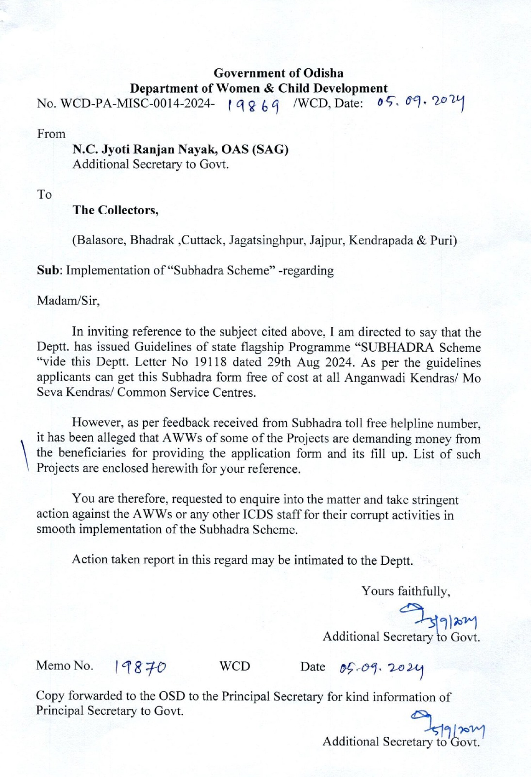 ତେଣୁ ସୁଭଦ୍ରା ଯୋଜନା କାର୍ଯ୍ୟକାରୀ ପାଇଁ ପ୍ରତିବନ୍ଧକ ସାଜିଥିବା ଦୁର୍ନୀତିଗ୍ରସ୍ତ କର୍ମଚାରୀଙ୍କ ବିରୋଧରେ କାର୍ଯ୍ୟାନୁଷ୍ଠାନ ଗ୍ରହଣ କରିବାକୁ ଜିଲ୍ଲାପାଳମାନଙ୍କୁ ଚିଠି କରି ନିର୍ଦ୍ଦେଶ ଦିଆଯାଇଛି। ବାଲେଶ୍ୱରର ଖଇରା, ଭଦ୍ରକର ଧାମନଗର, କଟକର ୧୩ ନମ୍ବର ୱାର୍ଡ, ଜଗତସିଂହପୁରର ତିର୍ତ୍ତୋଲ, ଯାଜପୁରର ରସୁଲପୁର, କେନ୍ଦ୍ରାପଡାର ଆଳି, ପୁରୀର ପିପିଲି ଓ କାକଟପୁରରୁ ହିତାଧିକାରୀଙ୍କଠାରୁ ଟଙ୍କା ମଗାଯାଉଥିବା ଅଭିଯୋଗ ଆସିଛି।