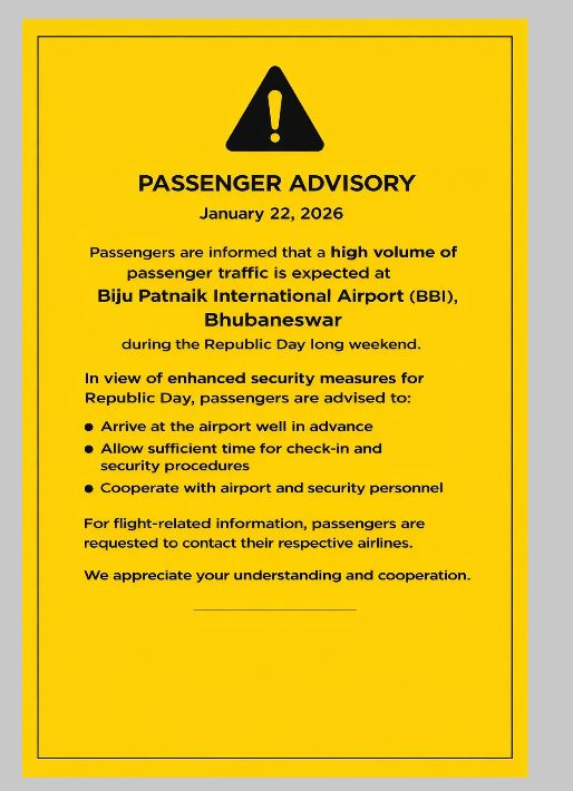 ସାଧାରଣ ଦିବସ ଉପଲକ୍ଷେ ଯାତ୍ରୀଙ୍କ ଭୁବନେଶ୍ୱର ବିଜୁ ପଟ୍ଟନାୟକ ଅନ୍ତର୍ଜାତୀୟ ବିମାନବନ୍ଦର ପକ୍ଷରୁ ନିର୍ଦ୍ଦେଶାବଳୀ ଜାରି ହୋଇଛି । ହାତରେ ଯଥେଷ୍ଟ ସମୟ ରଖି ବିମାନ ବନ୍ଦର ଆସନ୍ତୁ ଯାତ୍ରୀ । ଚେକ୍ ଇନ ପ୍ରକ୍ରିୟା ପାଇଁ ହାତରେ ଯଥେଷ୍ଟ ସମୟ ରଖନ୍ତୁ ବୋଲି ବିମାନବନ୍ଦର ପକ୍ଷରୁ କୁହାଯାଇଛି। ଆଗୁଆ ପହଞ୍ଚିବା ସହ ଚେକ୍-ଇନ୍ରେ ସମୟ ଦେବାକୁ ଯାତ୍ରୀଙ୍କୁ ଅନୁରୋଧ କରାଯିବା ସହ ବିମାନବନ୍ଦର ସୁରକ୍ଷାକର୍ମୀଙ୍କୁ ସହଯୋଗ କରିବା ପାଇଁ ଅନୁରୋଧ କରାଯାଇଛି । ସୂଚନା ଯୋଗ୍ୟ; ଜାନୁଆରୀ ୨୬ ତାରିଖ ସୋମବାର ଦିନ ସରକାରୀ ଛୁଟି ଥିବାରୁ, ସପ୍ତାହାନ୍ତ ପରେ, ଅନେକ ଯାତ୍ରୀ ନିଜ ସହରକୁ ଯାତ୍ରା ଯୋଜନା କରୁଛନ୍ତି, ଯାହା ଫଳରେ ଟିକେଟ ବୁକିଂ ଏବଂ ବିମାନବନ୍ଦରରେ ପାଦ ଦେବାର ସଂଖ୍ୟା ବୃଦ୍ଧି ପାଇଛି। ଆଗକୁ ତିନି ଦିନିଆ ସାପ୍ତାହିକ ଛୁଟି ପଡୁଛି । ଶନିବାର, ରବିବାର ଏବଂ ସୋମବାର ଲମ୍ବା ଛୁଟି ରହୁଛି । ତେଣୁ ଏହି ସମୟରେ ବିମାନ ବନ୍ଦରରେ ଯାତ୍ରୀଙ୍କ ଭିଡ଼ ମଧ୍ୟ ରହିବ । ତେଣୁ ବିମାନବନ୍ଦରରେ ନିର୍ଦ୍ଧାରିତ ସମୟ ପୂର୍ବରୁ ପହଁଚିବାକୁ ନିର୍ଦ୍ଦେଶ ଦିଆଯାଇଛି । ଆଗୁଆ ପହଁଚି ଚେକ୍-ଇନ୍ ପାଇଁ ପର୍ଯ୍ୟାପ୍ତ ସମୟ ଦେବା ସହିତ ସୁରକ୍ଷାକର୍ମୀଙ୍କୁ ସହଯୋଗ କରିବାକୁ ନିର୍ଦ୍ଦେଶାବଳୀରେ କୁହାଯାଇଛି । Post navigation Revenue Inspector in Vigilance Trap: ଭିଜିଲାନ୍ସ ଜାଲରେ ରେଭିନ୍ୟୁ ଇନିସ୍ପେକ୍ଟର