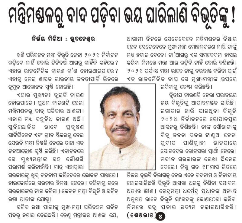 ଖଣି ପରିବହନ ମନ୍ତ୍ରୀ ବିଭୂତି ଜେନା ୨୦୨୯ ନିର୍ବାଚନ ଲଢ଼ିବେ ନାହିଁ ବୋଲି ତିନିବର୍ଷ ଆଗରୁ କାହିଁକି କହିଲେ ? ଏହାର ରାଜନୈତିକ କାରଣ କ’ଣ ହୋଇଥାଇପାରେ ? ଏହାକୁ ନେଇ ଶାସକ ଭାରତୀୟ ଜନତାପାର୍ଟି ଭିତରେ ତୁମୁଳ ଆଲୋଡନ ସୃଷ୍ଟି ହୋଇଛି। ଏହାର ମୁଖ୍ୟତଃ ଦୁଇଟି କାରଣ ହୋଇପାରେ । ପ୍ରଥମ କାରଣଟି ହେଲା ମନ୍ତ୍ରୀମଣ୍ଡଳରୁ ବାଦ୍ ପଡିବାର ଆଶଙ୍କା। ଏହାର ମଧ୍ୟ ବହୁବିଧ କାରଣ ଅଛି। ସୁନିୟୋଜିତ ଭାବେ ପ୍ରଦୂଷଣ ସାର୍ଟିଫିକେଟ ଏବଂ ଗ୍ରୀନ ଷ୍ଟିକରକୁ ନେଇ ଯେଭଳି ମନ୍ତ୍ରୀ ନିଷ୍ପତ୍ତି ନେଲେ ତାହା ଏକ ଜନଆକ୍ରୋଶ ସୃଷ୍ଟି କରିଛି। ଏବାବଦରେ ସେ ମୁଖ୍ୟମନ୍ତ୍ରୀଙ୍କ ସହ କୌଣସି ପରାମର୍ଶ କରିନାହାଁନ୍ତି । ମାତ୍ର ଏହାଦ୍ବାରା ସରକାରଙ୍କୁ ଖୁବ୍ ବଦନାମ କରିଦେଲେ ଲୋକଙ୍କ ପାଖରେ । ହାଇକୋର୍ଟରେ ସରକାର ହିନସ୍ତା ହେଲେ । କହିବାକୁ ଗଲେ ମନ୍ତ୍ରୀ ବିଭୂତି ସରକାରଙ୍କର ନାକ କଟିଲା । କେବଳ ମନ୍ତ୍ରୀ ଉଷ ପାଢୀଙ୍କ ଯୋଗୁ। ସଚିବ ଉଷା ପାଢୀଙ୍କୁ ମୁଖ୍ୟମନ୍ତ୍ରୀ ପରିବହନ ସଚିବ ପଦରୁ ହଟାଇ ଦେଇଛନ୍ତି। ତେଣୁ ମନ୍ତ୍ରୀଙ୍କର ଆଶଙ୍କା ଯେ, ଆଗାମୀ ଦିନରେ ଯେତେବେଳେ ମନ୍ତ୍ରିମଣ୍ଡଳର ବିସ୍ତାର ହେବ ସେତେବେଳେ ମୁଖ୍ୟମନ୍ତ୍ରୀ ମୋହନ ଚରଣ ମାଝି ତାଙ୍କୁ ମଧ୍ୟ ହଟାଇ ଦେବେ । ତା’ ଆଗରୁ ଏକ ସମବେଦନା ହାସଲ କରିବା ନିମନ୍ତେ ମନ୍ତ୍ରୀ ଆଉ ଲଢ଼ିବି ନାହିଁ ବୋଲି କହିଛନ୍ତି । ୨୦୨୯ ପର୍ଯ୍ୟନ୍ତ ମନ୍ତ୍ରୀ ଭାବେ ତାଙ୍କୁ ବରଦାସ୍ତ କରିବା ପାଇଁ ଏକ ରାଜନୈତିକ ଚାପ ସେ ମୁଖ୍ୟମନ୍ତ୍ରୀଙ୍କ ଉପରେ ଲଢିବାକୁ ଚେଷ୍ଟା କରିଛନ୍ତି। ଦ୍ବିତୀୟ କାରଣଟି ହେଲା ପରାଜୟର ଭୟ ବିଭୂତିଙ୍କୁ ଆପାଦମସ୍ତକ ଘାରିଛି । ଲଗାତାର ହାରି ଯାଉଥିବା ବିଭୂତି ୨୦୨୪ ନିର୍ବାଚନରେ ଗୋପାଳପୁର ଆସନରୁ ଜିଣିଛନ୍ତି । ତାଙ୍କ ସୌଭାଗ୍ୟକୁ ବିଜୁ ଜନତା ଦଳର ଟାଣୁଆ ନେତା ପ୍ରଦୀପ ପାଣିଗ୍ରାହୀ ଭାଜପାରେ ଯୋଗଦେଇ ଲୋକସଭା ପ୍ରାର୍ଥି ହେଲେ। ନବୀନ ସରକାରଙ୍କ ଲେଖା ଛିଡେଇ ଦେଲେ । କିନ୍ତୁ ଗତ ୧୮ ମାସ ଭିତରେ ନିଜର ଦୁଇଟି ବିଭାଗକୁ ନେଇ ଏତେ ବଦନାମ ଓ ଦନାମ ଓ ବିବାଦୀୟ ହୋଇସାରିଛନ୍ତି ବିଭୂତି ଆସନ୍ତା ଥରକୁ ଜିଣିବା ସମ୍ଭାବନା ଅତ୍ୟନ୍ତ କ୍ଷୀଣ। କେନ୍ଦ୍ରମନ୍ତ୍ରୀ ଧର୍ମେନ୍ଦ୍ର ପ୍ରଧାନଙ୍କ ଅତ୍ୟନ୍ତ ଅନୁଗତ ଭାବେ ବିଭୂତି ସାଂସଦଙ୍କୁ କୋଣଠେସା କରିବା ନିମନ୍ତେ ସବୁ ପ୍ରକାର ଉଦ୍ୟମ ଚଳାଇଆସିଛନ୍ତି । କିନ୍ତୁ ତେଣେ ଧର୍ମେନ୍ଦ୍ର କେନ୍ଦ୍ରରେ ଅତ୍ୟନ୍ତ ବିବାଦୀୟ ହୋଇସାରିଛନ୍ତି । ଏହି କାରଣରୁ ବିଭୂତିଙ୍କ ଠାଣି ଓ ଟାଣ ସବୁ ହୁଗୁଳି ଯାଇଛି। ହାରିବା ଭୟରେ ଲଢିବି ନାହିଁ କହି ସମର୍ଥକଙ୍କ ସମର୍ଥନ ହାସଲ ପାଇଁ ଉଦ୍ୟମ କରି ମନ୍ତ୍ରୀ ବିଫଳ ହୋଇଛନ୍ତି। ତାଙ୍କ ଉପରେ ଦଳୀୟ କର୍ମୀମାନେ ଏତେ ଅସନ୍ତୁଷ୍ଟ ଯେ, ସେ ଜାଣି ସାରି ଲେଣି ଆରଥରକୁ ତାଙ୍କ ଅବସ୍ଥା କ’ଣ ହେବାକୁ ଯାଉଛି ? ଏଥିପାଇଁ ଆଦର୍ଶ ନେତାର ନାଟକ କରିବାକୁ ବିଭୂତି ଅପଚେଷ୍ଟା କରୁଛନ୍ତି ବୋଲି ତଥ୍ୟାଭିଜ୍ଞ ମହଲ ମନେକରନ୍ତି। Post navigation Assault Of Tibetan Girl In Gajapati: ଗଜପତିରେ ତିବ୍ବତୀୟ ଯୁବତୀଙ୍କୁ ଯୌନ ନିର୍ଯାତନା ମାମଲାରେ ନାବାଳକ ଅଟକ Opposition To Move No-Confidence Against Om Birla: ଲୋକସଭା ବାଚସ୍ପତି ଓମ୍ ବିର୍ଲାଙ୍କ ବିରୋଧରେ ଆସିପାରେ ଅନାସ୍ଥା