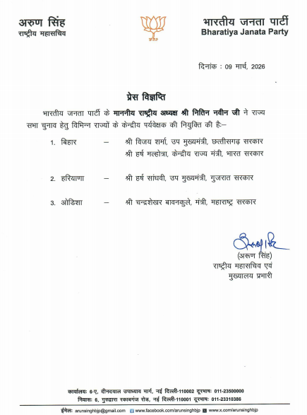 ୩ ରାଜ୍ୟ ପାଇଁ ପର୍ଯ୍ୟବେକ୍ଷକ ନିଯୁକ୍ତ କଲା ବିଜେପି। ଭାରତୀୟ ଜନତା ପାର୍ଟି (ବିଜେପି)ର ରାଷ୍ଟ୍ରୀୟ ଅଧ୍ୟକ୍ଷ ନୀତିନ ନବିନ ସୋମବାର ବିହାର, ହରିୟାଣା ଏବଂ ଓଡିଶାରେ ରାଜ୍ୟସଭା ନିର୍ବାଚନ ପାଇଁ କେନ୍ଦ୍ରୀୟ ପର୍ଯ୍ୟବେକ୍ଷକ ନିଯୁକ୍ତ କରିଛନ୍ତି। ମହାରାଷ୍ଟ୍ର ସରକାରର ମନ୍ତ୍ରୀ ଚନ୍ଦ୍ରଶେଖର ବାବନକୁଳେ ଓଡ଼ିଶା ପର୍ଯ୍ୟବେକ୍ଷକ ହୋଇଥିବା ବେଳେ ଗୁଜରାଟ ଉପମୁଖ୍ୟମନ୍ତ୍ରୀ ହର୍ଷ ସାଙ୍ଗଭୀଙ୍କୁ ହରିୟାଣା ପର୍ଯ୍ୟବେକ୍ଷକ ଓ ଛତିଶଗଡ଼ ଉପମୁଖ୍ୟମନ୍ତ୍ରୀ ବିଜୟ ଶର୍ମା ଓ କେନ୍ଦ୍ରମନ୍ତ୍ରୀ ହର୍ଷ ମଲହୋତ୍ରାଙ୍କୁ ବିହାର ଦାୟିତ୍ବ ଦିଆଯାଇଛି। ୧୦ଟି ରାଜ୍ୟର ୩୭ଟି ଆସନ ପୂରଣ ପାଇଁ ରାଜ୍ୟ ପରିଷଦ (ରାଜ୍ୟସଭା) ପାଇଁ ଆଗାମୀ ଦ୍ୱିବାର୍ଷିକ ନିର୍ବାଚନ ପାଇଁ ମତଦାନ ମାର୍ଚ୍ଚ ୧୬ରେ ଅନୁଷ୍ଠିତ ହେବାକୁ ଯାଉଛି, ସେହି ଦିନ ସନ୍ଧ୍ୟା ୫ଟାରେ ଭୋଟ ଗଣତି ହେବ। ମହାରାଷ୍ଟ୍ର, ଓଡିଶା, ତାମିଲନାଡୁ, ପଶ୍ଚିମବଙ୍ଗ, ଆସାମ, ବିହାର, ଛତିଶଗଡ଼, ହରିୟାଣା, ହିମାଚଳ ପ୍ରଦେଶ ଏବଂ ତେଲେଙ୍ଗାନାରୁ ନିର୍ବାଚିତ ୩୭ ଜଣ ସଦସ୍ୟଙ୍କ କାର୍ଯ୍ୟକାଳ ଏପ୍ରିଲ ମାସରେ ଶେଷ ହେବ, ନୂତନ ସଦସ୍ୟଙ୍କ ପାଇଁ ଆସନ ଖାଲି ହେବ। ଓଡିଶାର ଚାରୋଟି ରାଜ୍ୟସଭା ଆସନ ପାଇଁ ମୋଟ ପାଞ୍ଚ ଜଣ ପ୍ରାର୍ଥୀ – ବିଜେପି ଏବଂ ବିଜେଡିରୁ ଦୁଇଜଣ ଏବଂ ଭଗ୍ନ ଦଳ ଦ୍ୱାରା ସମର୍ଥିତ ଜଣେ – ସେମାନଙ୍କର ନାମାଙ୍କନ ପତ୍ର ଦାଖଲ କରିଛନ୍ତି। ବିଜେପିର ଦୁଇ ଜଣ ଆଧିକାରିକ ପ୍ରାର୍ଥୀ – ଦଳର ରାଜ୍ୟ ସଭାପତି ମନମୋହନ ସାମଲ ଏବଂ ରାଜ୍ୟସଭା ସାଂସଦ ସୁଜିତ କୁମାର – ସେମାନଙ୍କର ନାମାଙ୍କନ ପତ୍ର ଦାଖଲ କରିଛନ୍ତି, ପୂର୍ବତନ କେନ୍ଦ୍ରମନ୍ତ୍ରୀ ଦିଲୀପ ରାୟଙ୍କ ବ୍ୟତୀତ, ଯିଏ ସ୍ୱାଧୀନ ଭାବରେ ପ୍ରତିଦ୍ୱନ୍ଦ୍ୱିତା କରୁଛନ୍ତି । ସେହିପରି ବିଜେଡି ପ୍ରାର୍ଥୀ – ଦଳର ନେତା ସଂତୃପ୍ତ ମିଶ୍ର ଏବଂ ଡକ୍ଟର ଦତ୍ତେଶ୍ୱର ହୋତା, ଯାହାଙ୍କୁ କଂଗ୍ରେସ ଏବଂ ସିପିଆଇ(ଏମ୍) ସମର୍ଥନ କରୁଛନ୍ତି । Post navigation Rajya Sabha Election: ରାଜ୍ୟସଭା ନିର୍ବାଚନ; ହ୍ୱିପ୍ ନାହିଁ, ସଭ୍ୟପଦ ରଦ୍ଦ ହେବନାହିଁ Iran-US conflict: ବିଶ୍ୱ ବଜାରରେ ଯୁଦ୍ଧ ପ୍ରଭାବ; ୧୦୦ ଡଲାର ଟପିଲା ଅଶୋଧିତ ତୈଳ ମୂଲ୍ୟ