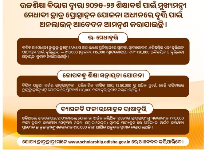 ମୁଖ୍ୟମନ୍ତ୍ରୀ ମେଧାବୀ ଛାତ୍ର ପ୍ରୋତ୍ସାହନ ଯୋଜନା ଆବେଦନ ଅବଧି ବଢ଼ିଲା । ଇ-ମେଧାବୃତ୍ତି, ବ୍ୟାସକବି ଫକୀରମୋହନ ଭାଷାବୃତ୍ତି ଆବେଦନ ଅବଧି ବୃଦ୍ଧି ହୋଇଛି। ଏହା ସହ ଗୋପବନ୍ଧୁ ଶିକ୍ଷା ସହାୟତା ଯୋଜନା ଅବଧି ମଧ୍ୟ ବୃଦ୍ଧି କରାଯାଇଛି। ଯୋଜନାରେ ଆବେଦନ ପ୍ରକ୍ରିୟା ଶୁକ୍ରବାର ସରୁଥିବା ବେଳେ ଏହା ଏବେ ପୁଣି ୨୪ ତାରିଖ ପର୍ଯ୍ୟନ୍ତ ଚାଲିବ ବୋଲି ଶୁକ୍ରବାର ଉଚ୍ଚଶିକ୍ଷା ବିଭାଗ ପକ୍ଷରୁ ବିଜ୍ଞପ୍ତି ଜାରି ହୋଇଛି। ସେହିପରି, ମେଧାବୃତ୍ତି ଆପ୍ଲିକେସନ୍ ତର୍ଜମା କରିବା ପାଇଁ ୩୧ ତାରିଖ ପର୍ଯ୍ୟନ୍ତ ଅବଧି ରଖାଯାଇଛି। କେବଳ ଗୋପନ୍ଧୁ ଶିକ୍ଷା ସହାୟତା ଯୋଜନାରେ ହସ୍ତଗତ ଆପ୍ଲିକେସନ୍ ତର୍ଜମା ପାଇଁ ନଭେମ୍ବର ୧୫ ପର୍ଯ୍ୟନ୍ତ ତାରିଖ ନିର୍ଦ୍ଧାରଣ କରାଯାଇଛି। ଇ-ମେଧାବୃତ୍ତି ସ୍କଲାର୍ସିପ୍, ବ୍ୟାସକବି ଫକୀରମୋହନ ମେଧା ଭାଷାବୃତ୍ତି ଓ ଗୋପବନ୍ଧୁ ଶିକ୍ଷା ସହାୟତା ଯୋଜନାକୁ ଗୋଟିଏ ୱେବ୍ସାଇଟ୍ www.schlorship.odisha.gov.in ରେ ଆବେଦନ କରିପାରିବେ। ଏହି ଯୋଜନା ଦ୍ୱାରା ପ୍ରାକ ଏବଂ ପରବର୍ତ୍ତୀ ଦଶମ ଶ୍ରେଣୀର ଆବାସିକ ଶିକ୍ଷା ଓ ଛାତ୍ରବୃତ୍ତି ପାଉଥିବା ଛାତ୍ରଛାତ୍ରୀ ଉପଯୁକ୍ତ ହୋଇପାରିବ । ‘ମୁଖ୍ୟମନ୍ତ୍ରୀ ମେଧାବୀ ଛାତ୍ର ପ୍ରୋତ୍ସାହନ ଯୋଜନା’ରେ ମାଟ୍ରିକ ପରବର୍ତ୍ତୀ ପାଠ ପଢିବାକୁ ଚାହୁଁଥିବା ଅନୁସୁଚିତ ଜାତି ଓ ଜନଜାତି ଛାତ୍ରଛାତ୍ରୀଙ୍କ ଉଚ୍ଚ ଶିକ୍ଷା, ବୈଷୟିକ ଶିକ୍ଷା ଏବଂ ବୃତ୍ତିଗତ ଶିକ୍ଷା ପାଇଁ ଛାତ୍ରବୃତ୍ତିରେ ସହାୟକ ହେବ । Post navigation ରାଜ୍ୟ ସରକାରୀ କୋଠା ବାହାରେ ଲାଗିବ ସିସିଟିଭି ଅର୍ଥନୀତି ବିଜ୍ଞାନରେ ୩ ବିଶିଷ୍ଟ ବୈଜ୍ଞାନିକଙ୍କୁ ମିଳିବ ନୋବେଲ ପୁରସ୍କାର