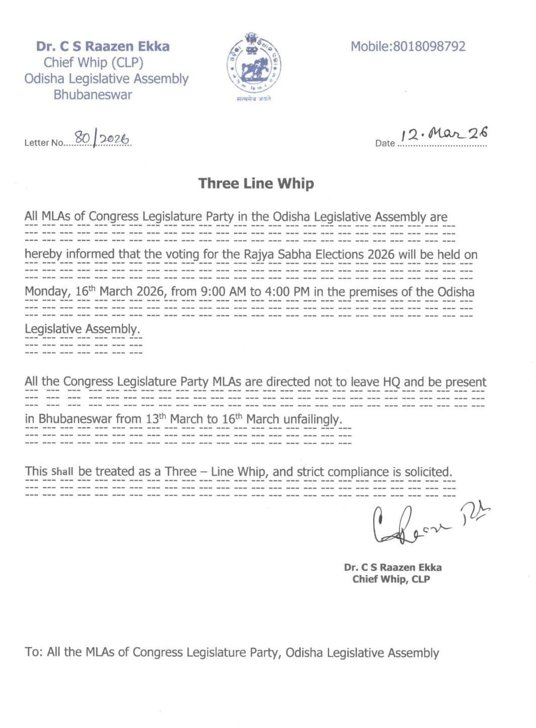 ରାଜ୍ୟସଭା ପାଇଁ ରାଜନୀତି ସରଗରମ ହୋଇଛି । ଏହାରି ମଧ୍ୟରେ ବିଜେଡି ପରେ ଏବେ ରାଜ୍ୟସଭା ନିର୍ବାଚନକୁ ନେଇ ହ୍ବିପ୍ ଜାରି କଲା କଂଗ୍ରେସ। କଂଗ୍ରେସ ତାର ବିଧାୟକମାନଙ୍କୁ ଏକ ହ୍ୱିପ୍ ଜାରି କରିଛି। ସମସ୍ତ କଂଗ୍ରେସ ବିଧାୟକଙ୍କୁ ୧୩ ମାର୍ଚ୍ଚରୁ ୧୬ ମାର୍ଚ୍ଚ ପର୍ଯ୍ୟନ୍ତ ମୁଖ୍ୟାଳୟ ଛାଡି ନ ଯିବାକୁ ଏବଂ ଭୁବନେଶ୍ୱରରେ ଉପସ୍ଥିତ ରହିବାକୁ ନିର୍ଦ୍ଦେଶ ଦିଆଯାଇଛି। ଚତୁର୍ଥ ଆସନ ପାଇଁ ଶାସକ ବିଜେପି ଓ ଦୁଇ ବିରୋଧୀ ବିଜେଡି-କଂଗ୍ରେସ ମଧ୍ୟରେ ସିଧାସଳକ ଲଢେଇ ଚାଲିଛି। ସଂସଦର ଉଚ୍ଚସଦନର ଚତୁର୍ଥ ଆସନ ପାଇଁ ବିଜେଡି ଓ କଂଗ୍ରେସ ମିଳିତ ସମର୍ଥନରେ ଡ. ଦତ୍ତେଶ୍ଵର ହୋତାଙ୍କୁ ପ୍ରାର୍ଥୀ କରିଛି। ଏହା ସହ ପୂର୍ବତନ ବିଧାୟକ ତଥା ପୂର୍ବତନ କେନ୍ଦ୍ର ମନ୍ତ୍ରୀ ଦିଲ୍ଲୀପ ରାୟଙ୍କୁ ସ୍ଵାଧୀନ ପ୍ରାର୍ଥୀ ଭାବେ ମଇଦାନକୁ ଓହ୍ଲାଇଛି ବିଜେପି। ବିଜେପି ପାର୍ଟିର ହୋଇ ଦିଲ୍ଲୀପ ରାୟ ନିଜକୁ ସ୍ଵାଧୀନ ପ୍ରାର୍ଥୀ ଭାବେ ନାମାଙ୍କନ ପତ୍ର ଦାଖଲ କରିଛନ୍ତି। ଆଜି କଂଗ୍ରେସ ପାଖରୁ ଜାରି ଏକ ନୋଟରେ କୁହାଯାଇଛି, କଂଗ୍ରେସର ସମସ୍ତ ବିଧାୟକଙ୍କୁ ଜଣାଇ ଦିଆଯାଉଛି ଯେ ୨୦୨୬ ମସିହାର ରାଜ୍ୟସଭା ନିର୍ବାଚନ ପାଇଁ ଭୋଟ୍ ୧୬ ମାର୍ଚ୍ଚ ସୋମବାର ସକାଳ ୯ ଟାରୁ ଅପରାହ୍ନ ୪ ଟା ପର୍ଯ୍ୟନ୍ତ ଓଡ଼ିଶା ବିଧାନସଭା ପରିସରରେ ଅନୁଷ୍ଠିତ ହେବ। ବିଧାୟକମାନଙ୍କୁ ମୁଖ୍ୟାଳୟ ଛାଡି ନ ଯିବାକୁ ଏବଂ ମାର୍ଚ୍ଚ ୧୩ ରୁ ୧୬ ପର୍ଯ୍ୟନ୍ତ ଭୁବନେଶ୍ୱରରେ ଉପସ୍ଥିତ ରହିବାକୁ ନିର୍ଦ୍ଦେଶ ଦିଆଯାଇଛି। ଏହାକୁ ତିନି ଧାଡି ହ୍ୱିପ୍ ଭାବରେ ବିବେଚନା କରାଯାଇପାରେ ଏବଂ କଡ଼ା ପାଳନ କରିବାକୁ ଅନୁରୋଧ କରାଯାଇଛି। ସୂଚନା ଯୋଗ୍ୟ ନିରଞ୍ଜନ ବିଶି, ମୁନ୍ନା ଖାନ (ବିଜେଡି), ସୁଜିତ କୁମାର ଏବଂ ମମତା ମହାନ୍ତ (ବିଜେପି)ଙ୍କ ଅବସର ପରେ ଏପ୍ରିଲ ୨, ୨୦୨୬ ରେ ଚାରୋଟି (୪) ଆସନ ଖାଲି ପଡୁଛି। ଖାଲିଥିବା ଆସନ ପାଇଁ ବିଜେଡି ସଂତୃପ୍ତ ମିଶ୍ର ଏବଂ ଡକ୍ଟର ଦତ୍ତେଶ୍ୱର ହୋତାଙ୍କୁ ପ୍ରାର୍ଥୀ କରିଛି, ଯେତେବେଳେ ଶାସକ ବିଜେପି ମନମୋହନ ସାମଲ ଏବଂ ସୁଜିତ କୁମାରଙ୍କୁ ପ୍ରାର୍ଥୀ କରିଛି। ସ୍ୱାଧୀନ ପ୍ରାର୍ଥୀ ଭାବରେ ପ୍ରତିଦ୍ୱନ୍ଦ୍ୱିତା କରୁଥିବା ବରିଷ୍ଠ ନେତା ଦିଲ୍ଲୀପ ରାୟଙ୍କୁ ମଧ୍ୟ ବିଜେପି ସମର୍ଥନ କରିଛି। ରାଜ୍ୟସଭା ନିର୍ବାଚନ ୧୬ ମାର୍ଚ୍ଚ, ୨୦୨୬ ରେ ଅନୁଷ୍ଠିତ ହେବାକୁ ସ୍ଥିର ହୋଇଛି। ଭାରତୀୟ ନିର୍ବାଚନ କମିଶନ (ECI) ଦ୍ୱାରା ଜାରି ବିଜ୍ଞପ୍ତି ଅନୁଯାୟୀ, ନାମାଙ୍କନ ଦାଖଲର ଶେଷ ତାରିଖ ୫ ମାର୍ଚ୍ଚ ଥିଲା। ନାମାଙ୍କନ ପତ୍ର ଯାଞ୍ଚ ୬ ମାର୍ଚ୍ଚରେ କରାଯାଇଥିଲା, ଯାହା ପରେ ପାଞ୍ଚ ଜଣ ପ୍ରାର୍ଥୀଙ୍କ ନାମାଙ୍କନ ବୈଧ ବୋଲି ଜଣାପଡିଥିଲା। ୧୬ ମାର୍ଚ୍ଚ ସକାଳ ୯ ଟାରୁ ଅପରାହ୍ନ ୪ ଟା ପର୍ଯ୍ୟନ୍ତ ମତଦାନ ହେବ, ଏବଂ ଭୋଟ ଗଣତି ସେହି ଦିନ ସନ୍ଧ୍ୟା ୫ ଟାରେ ଆରମ୍ଭ ହେବ। କମିଶନ କହିଛନ୍ତି ଯେ ସମଗ୍ର ନିର୍ବାଚନ ପ୍ରକ୍ରିୟା ୨୦ ମାର୍ଚ୍ଚ ସୁଦ୍ଧା ଶେଷ ହେବ। Post navigation Puri Municipal Corporation: ପୁରୀ ମହାନଗର ନିଗମ ଗଠନ ନେଇ ପ୍ରକାଶ ପାଇଲା ଚୂଡ଼ାନ୍ତ ବିଜ୍ଞପ୍ତି