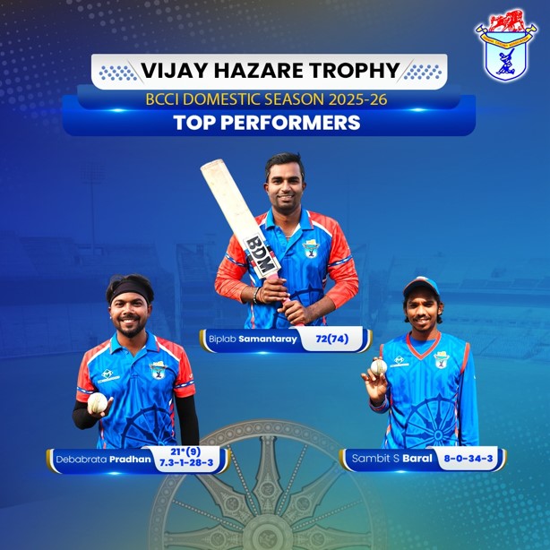 ନୂଆ ବର୍ଷ ପୂର୍ବରୁ ବିଜୟ ଭେଟି ଦେଲା ଓଡ଼ିଶା କ୍ରିକେଟ୍ ଟିମ୍ । ବେଙ୍ଗାଲୁରୁଠାରେ ଚାଲିଥିବା ବିଜୟ ହଜାରେ ଟ୍ରଫି ପ୍ରତିଯୋଗିତାରେ ଓଡ଼ିଆ ଖେଳାଳି ପୁଣି ଚମକ ଦେଖାଇଛନ୍ତି । ବୁଧବାର ଦିନ ଶକ୍ତିଶାଳୀ ଦିଲ୍ଲୀକୁ ୭୯ ରନ୍ରେ ହରାଇଛି ଓଡ଼ିଶା କ୍ରିକେଟ୍ ଦଳ । ପ୍ରଥମେ ବ୍ୟାଟିଂ କରି ଓଡିଶା ନିର୍ଦ୍ଧାରିତ ଓଭରରେ ୮ ୱିକେଟ ବିନିମୟରେ ୨୭୨ ରନ କରିଥିଲା । ଦିଲ୍ଲୀକୁ ଓଡ଼ିଶା ୨୭୩ ରନ୍ର ଟାର୍ଗେଟ୍ ଦେଇଥିଲା ତେବେ ୪୨.୩ ଓଭର ରେ ମାତ୍ର ୧୯୩ ରନ୍ରେ ଦିଲ୍ଲୀ ଦଳ ଅଲ୍ଆଉଟ୍ ହୋଇଥିଲା । ଓଡ଼ିଶା ପକ୍ଷରୁ ଦେବବ୍ରତ, ସମ୍ବିତ୍ ବରାଳଙ୍କୁ ୩ ଲେଖାଏଁ ୱିକେଟ୍ ମିଳିଥିବାବେଳେ ରାଜେଶଙ୍କୁ ୨ ଓ ବାଦଲଙ୍କୁ ଗୋଟିଏ ୱିକେଟ୍ ନେବାର ସଫଳତା ମିଳିଥିଲା । ଅଧିନାୟକ ବିପ୍ଲବ ସାମନ୍ତରାୟଙ୍କ ଦମ୍ଦାର ୭୨ ରନ୍ ଓଡ଼ିଶାକୁ ବିଜୟ ଲାଭ କରିବାରେ ସହାୟ ହୋଇଥିଲା । ଷ୍ଟାର ବ୍ୟାଟର ରିଷଭ୍ ପନ୍ତଙ୍କୁ ଦେବବ୍ରତ ୨୪ ରନ୍ରେ ଆଉଟ୍ କରିଥିଲେ । ଅନ୍ୟମାନଙ୍କ ମଧ୍ୟରେ ଗୋବିନ୍ଦ ପୋଦ୍ଦାର ୩୫, ସ୍ୱସ୍ତିକ ସାମଲ ୨୮ ଓ ଓମ ଟି ମୁଣ୍ଡେ ୨୬ ରନ କରିଥିଲେ । Post navigation IAS Promotion: ୩ ବରିଷ୍ଠ ଆଇଏଏସଙ୍କୁ ମିଳିଲା ପ୍ରମୁଖ ସଚିବ ପାହ୍ୟା ପଦୋନ୍ନତି Puri Upgraded To Municipal Corporation: ପୁରୀ ପୌରପାଳିକା ହେଲା ପୁରୀ ମହାନଗର ନିଗମ