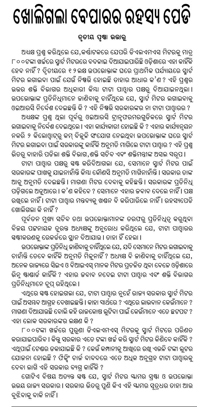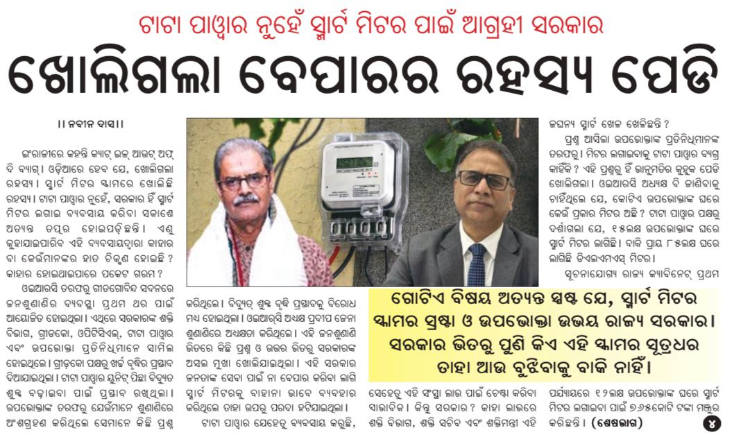 ଇଂରାଜୀରେ କହନ୍ତି କ୍ୟାଟ୍ ଇଜ୍ ଆଉଟ୍ ଅଫ୍ ଦି ବ୍ୟାଗ୍ । ଓଡ଼ିଆରେ ହେବ ଯେ, ଖୋଲିଗଲା ରହସ୍ୟ। ସ୍ମାର୍ଟ ମିଟର ସ୍କାମରେ ଖୋଲିଛି ରହସ୍ୟ । ଟାଟା ପାୱାର ନୁହେଁ, ସରକାର ହିଁ ସ୍ମାର୍ଟ ମିଟର ଲଗାଇ ବ୍ୟବସାୟ କରିବା ସକାଶେ ଅତ୍ୟନ୍ତ ତତ୍ପର ହୋଇପଡ଼ିଛନ୍ତି । ଏଣୁ କୁହାଯାଇପାରିବ ଏହି ବ୍ୟବସାୟଦ୍ୱାରା କାହାର ବା କେଉଁମାନଙ୍କର ହାତ ଚିକ୍କଣ ହୋଇଛି ? କାହାର ହୋଇଥାଇପାରେ ପକେଟ ଗରମ ? ଓଇଆରସି ତରଫରୁ ଗୀତଗୋବିନ୍ଦ ସଦନରେ ଜନଶୁଣାଣିର ବ୍ୟବସ୍ଥା ପ୍ରଥମ ଥର ପାଇଁ ଆୟୋଜିତ ହୋଇଥିଲା । ଏଥିରେ ସରକାରଙ୍କ ଶକ୍ତି ବିଭାଗ, ଗ୍ରୀଡକୋ, ଓପିଟିସିଏଲ୍, ଟାଟା ପାୱାର ଏବଂ ଉପଭୋକ୍ତା ପ୍ରତିନିଥିମାନେ ସାମିଲ ହୋଇଥିଲେ । ଗ୍ରୀଡ଼କୋ ପକ୍ଷରୁ ଖର୍ଚ୍ଚ ବୃଦ୍ଧିର ପ୍ରସ୍ତାବ ଦିଆଯାଇଥିଲା । ଟାଟା ପାୱାର ୟୁନିଟ୍ ପିଛା ବିଦ୍ୟୁତ ଶୁକ୍ଳ ବଢ଼ାଇବା ପାଇଁ ପ୍ରସ୍ତାବ ରଖୁଥିଲା। ଉପଭୋକ୍ତାଙ୍କ ତରଫରୁ ଯେଉଁମାନେ ଶୁଣାଣିରେ ଅଂଶଗ୍ରହଣ କରିଥିଲେ ସେମାନେ କିଛି ପ୍ରଶ୍ନ କରିଥିଲେ। ବିଦ୍ୟୁତ୍ ଶୁଳ୍କ ବୃଦ୍ଧି ପ୍ରସ୍ତାବକୁ ବିରୋଧ ମଧ୍ୟ ହୋଇଥିଲା। ଓଇଆର୍ସି ଅଧ୍ଯକ୍ଷ ପ୍ରଦୀପ ଜେନା ଶୁଣାଣିରେ ଅଧ୍ୟକ୍ଷତା କରିଥିଲେ। ଏହି ଜନଶୁଣାଣି ଭିତରେ କିଛି ପ୍ରଶ୍ନ ଓ ଉତ୍ତର ଭିତରୁ ସରକାରଙ୍କ ଅସଲ ମୁଖା ଖୋଲିଯାଇଥିଲା। ଏହି ସରକାର ଜନତାଙ୍କ ସେବା ପାଇଁ ନା ବେପାର କରିବା ଲାଗି ସ୍ମାର୍ଟ ମିଟରକୁ ବାହାନା ଭାବେ ବ୍ୟବହାର କରିଥିଲେ ତାହା ଉପରୁ ପରଦା ହଟିଯାଇଥିଲା। ଟାଟା ପାଓ୍ବାର ଯେହେତୁ ବ୍ୟବସାୟ କରୁଛି, ସେହେତୁ ଏହି ସଂସ୍ଥା ଲାଭ ପାଇଁ ଚେଷ୍ଟା କରିବା ସ୍ଵଭାବିକ। କିନ୍ତୁ ସରକାର ? କାହା ଲାଭରେ ଶକ୍ତି ବିଭାଗ, ଶକ୍ତି ସଚିବ ଏବଂ ଶକ୍ତିମନ୍ତ୍ରୀ ଏହି ଜଘନ୍ୟ ସ୍ମାର୍ଟ ଖେଳ ଖେଳିଛନ୍ତି ? ପ୍ରଶ୍ନ ଆସିଲା ଉପଭୋକ୍ତାଙ୍କ ପ୍ରତିନିଧିମାନଙ୍କ ତରଫରୁ। ମିଟର ଲଗାଇବାକୁ ଟାଟା ପାଓ୍ବାର ବ୍ୟଗ୍ର କାହିଁକି ? ଏହି ପ୍ରଶ୍ନରୁ ହିଁ ଭାନୁମତିର କୁହୁକ ପେଡି ଖୋଲିଗଲା। ଓଇଆରସି ଅଧ୍ୟକ୍ଷ ବି ଜାଣିବାକୁ ଚାହିଁଥିଲେ ଯେ, କୋଟିଏ ଉପଭୋକ୍ତାଙ୍କ ଘରେ କେଉଁ ପ୍ରକାର ମିଟର ଅଛି ? ଟାଟା ପାଓ୍ବାର ପକ୍ଷରୁ ଦର୍ଶାଗଲା ଯେ, ୧୫ଲକ୍ଷ ଉପଭୋକ୍ତାଙ୍କ ଘରେ ସ୍ମାର୍ଟ ମିଟର ଲାଗିଛି। ବାକି ପ୍ରାୟ ୮୫ଲକ୍ଷ ଘରେ ଲାଗିଛି ଡିଏଲଏମଏସ୍ ମିଟର। ସୂଚନାଯୋଗ୍ୟ ରାଜ୍ୟ କ୍ୟାବିନେଟ୍ ପ୍ରଥମ ପର୍ଯ୍ୟାୟରେ ୧୨ଲକ୍ଷ ଉପଭୋକ୍ତାଙ୍କ ଘରେ ସ୍ମାର୍ଟ ମିଟର ଲଗାଇବା ପାଇଁ ୭୬୫ କୋଟି ଟଙ୍କା ମଞ୍ଜୁର କରିଛନ୍ତି । ଅଧ୍ଯକ୍ଷ ପ୍ରଶ୍ନ କରିଥିଲେ ଯେ, କର୍ଣାଟକରେ ଯେପରି ଡି ଏଲଏମଏସ ମିଟରକୁ ମାତ୍ର ୮୦୦ଟଙ୍କା ଖର୍ଚ୍ଚରେ ସ୍ମାର୍ଟ ମିଟରରେ ବଦଳାଇ ଦିଆଯାଇପାରିଛି ଓଡ଼ିଶାରେ ଏହା କାହିଁକି ହେବ ନାହିଁ ? ଦ୍ବିତୀୟରେ ୧୨ଲକ୍ଷ ଉପଭୋକ୍ତାଙ୍କ ଘରେ ପ୍ରାଥମିକ ପର୍ଯ୍ୟାୟରେ ସ୍ମାର୍ଟ ମିଟର ଲଗାଇବା ପାଇଁ ଯେଉଁ ନିଷ୍ପତ୍ତି ହୋଇଛି ତାହାର ଆଧାର କ’ଣ ? ଏହି ପ୍ରଶ୍ନର ଉତ୍ତର ଶକ୍ତି ବିଭାଗର ଅଧିକାରୀ କିମ୍ବା ଟାଟା ପାଓ୍ବାର ପକ୍ଷରୁ ଦିଆଯାଇନଥିଲା। ଉପଭୋକ୍ତାଙ୍କ ପ୍ରତିନିଧିମାନେ ଜାଣିବାକୁ ଚାହିଁଥିଲେ ଯେ, ସ୍ମାର୍ଟ ମିଟର ଲଗାଇବାକୁ ଓଇଆରସି ନିର୍ଦ୍ଦେଶ ଦେଇଛନ୍ତି କି ? ଏହି ନିଷ୍ପତ୍ତି ସରକାରଙ୍କର ନା ଟାଟା ପାୱାରର ? ଅଧ୍ଯକ୍ଷଙ୍କ ପ୍ରଶ୍ନ ଥିଲା ପୂର୍ବରୁ ଓଇଆରସି ଟ୍ରାନ୍ସଫରମରଗୁଡିକରେ ସ୍ମାର୍ଟ ମିଟର ଲଗାଇବାକୁ ନିର୍ଦ