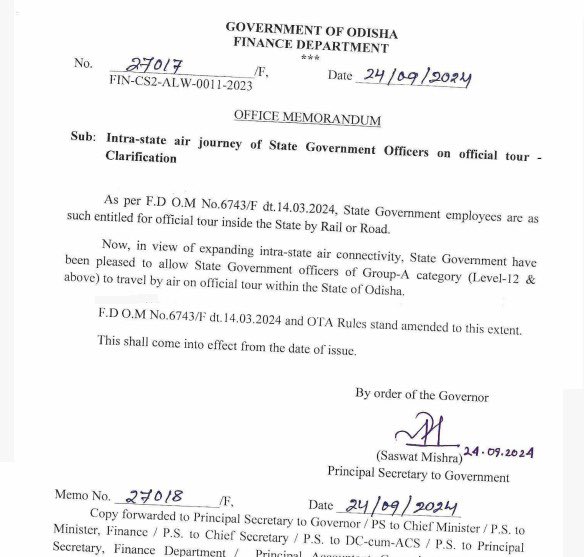 ଗ୍ରୁପ-ଏ ବର୍ଗର ସରକାରୀ କର୍ମଚାରୀ ସରକାରୀ କାମରେ ରାଜ୍ୟ ଭିତରେ ଓ ଟ୍ରେନ ବିମାନ ଯୋଗେ ଯାତ୍ରା କରିପାରିବେ। ଏ ନେଇ ଓଡ଼ିଶା ସରକାର ଅନୁମତି ଦେଇଛନ୍ତି। ରାଜ୍ୟ ଅର୍ଥ ବିଭାଗ ପକ୍ଷରୁ ଏ ନେଇ ବିଜ୍ଞପ୍ତି ପ୍ରକାଶ ପାଇଛି। ଗ୍ରୁପ୍-ଏ ବର୍ଗର (ଲେଭେଲ-୧୨ ଓ ତଦୁର୍ଦ୍ଧ) କର୍ମଚାରୀ ରାଜ୍ୟ ରାଜ୍ୟ ମଧ୍ୟରେ ବିମାନରେ ଯାତ୍ରା କରିବାକୁ ସରକାର ଅନୁମତି ଦେଇଛନ୍ତି। ବିଜ୍ଞପ୍ତି ପ୍ରକାଶ ପାଇବା ଦିନଠୁ ଏହା କାର୍ଯ୍ୟକାରୀ ହେବ। Post navigation ଓଡ଼ିଶା ଇଭି ପ୍ରୋଜେକ୍ଟରୁ ଓହରିବନି ଜେଏସଡବ୍ଲ୍ୟୁ ଦଶମ ଷାଣ୍ମାସିକ ପ୍ରଶ୍ନପତ୍ର ତିଆରି କରିବ ସ୍କୁଲ