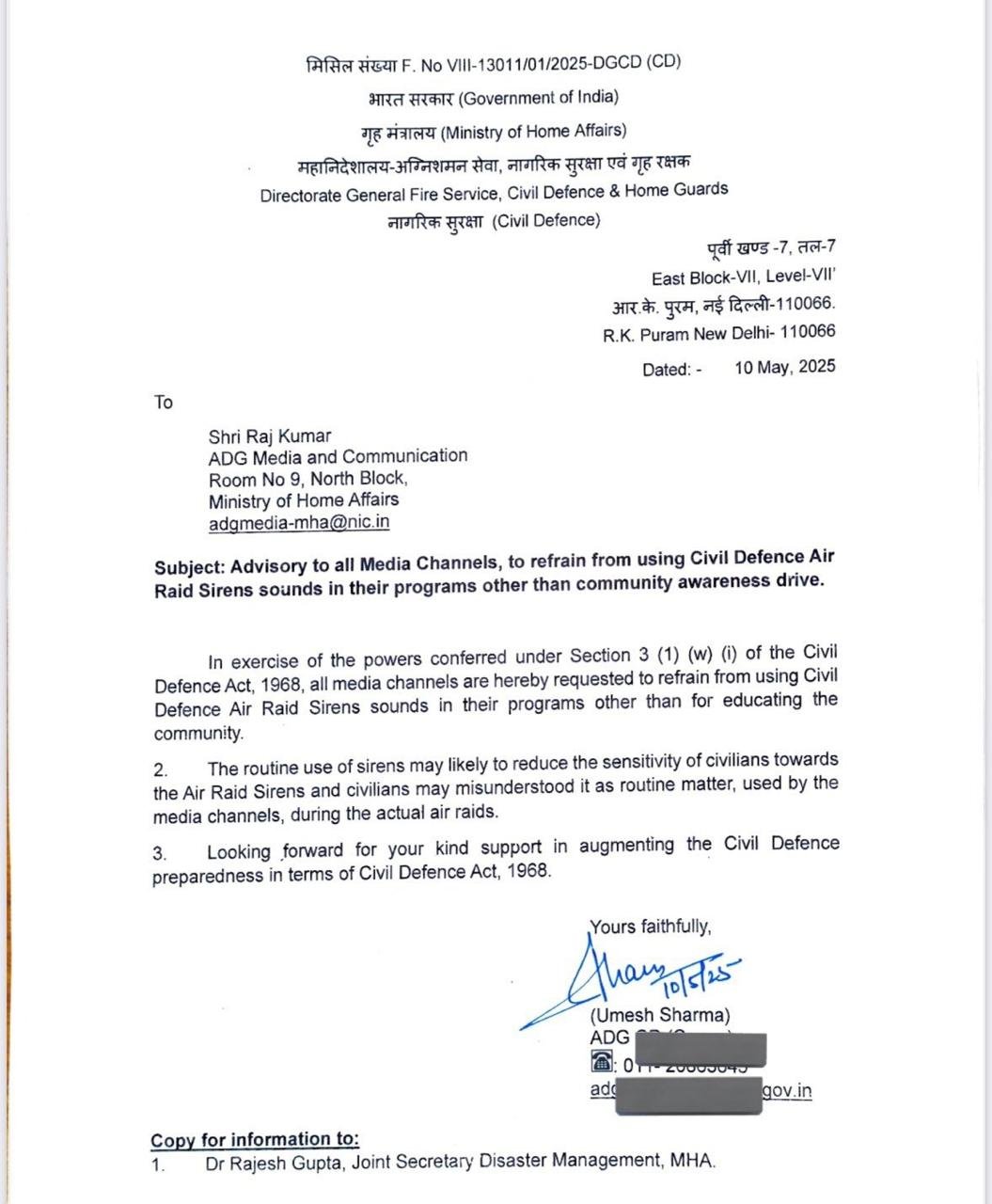 ସିଭିଲ ଡିଫେନ୍ସ ବ୍ୟତୀତ ଅନ୍ୟ କାରଣରେ ଯୁଦ୍ଧ ସାଇରନ ବାଜିବା ମନା । ଏ ନେଇ ଗୃହ ମନ୍ତ୍ରାଳୟ ପକ୍ଷରୁ ନିର୍ଦ୍ଦେଶନାମା ଜାରି ହୋଇଛି । କେନ୍ଦ୍ର ଗୃହ ମନ୍ତ୍ରଣାଳୟ ଶନିବାର ଦିନ ସମସ୍ତ ଗଣମାଧ୍ୟମ ସଚେତନ କରିବା ଡ୍ରାଇଭ୍ ବ୍ୟତୀତ ଅନ୍ୟ କାର୍ଯ୍ୟକ୍ରମରେ ସିଭିଲ ଡିଫେନ୍ସ ଏୟାର ରେଡ୍ ସାଇରନ୍ ବ୍ୟବହାର ନ କରିବାକୁ ପରାମର୍ଶ ଦେଇଛି । ଭାରତ-ପାକିସ୍ତାନ ଉତ୍ତେଜନା ବୃଦ୍ଧି ପାଉଥିବା ବେଳେ ଏବଂ ଭାରତର ବିଭିନ୍ନ ଅଞ୍ଚଳ ଆଡ଼କୁ ଡ୍ରୋନ୍ ଆକ୍ରମଣ ପରେ କର୍ତ୍ତୃପକ୍ଷଙ୍କୁ ଜନସାଧାରଣଙ୍କ ସୁରକ୍ଷା ପାଇଁ ଏୟାର ଷ୍ଟ୍ରାଇକ୍ ସାଇରନ୍ ଏବଂ ବ୍ଲାକ୍ ଆଉଟ୍ ଜାରି କରିବାକୁ ନିର୍ଦ୍ଦେଶ ଦିଆଯାଇଛି । ଲୋକଙ୍କ ମଧ୍ୟରେ ବିଭ୍ରାନ୍ତି ସୃଷ୍ଟିକୁ ନେଇ ଲୋକଙ୍କ ମଧ୍ୟରେ ବିଭ୍ରାନ୍ତି ସୃଷ୍ଟିକୁ ନେଇ ଏହି ନିର୍ଦ୍ଦେଶନାମା ଜାରି ହୋଇଛି । Post navigation ଭାରତର ବଡ଼ କ୍ଷତି ହୋଇଥିବା ନେଇ ପାକିସ୍ତାନ ବହୁ ମିଛ ଓ ଗୁଜବ ପ୍ରସାରିତ କରିଛି: କର୍ଣ୍ଣେଲ ସୋଫିଆ କୁରେଶୀ ଅପରେସନ ସିନ୍ଦୂରରେ ୫ ମୋଷ୍ଟ ୱାଣ୍ଟେଡ ଆତଙ୍କୀ ନିହତ