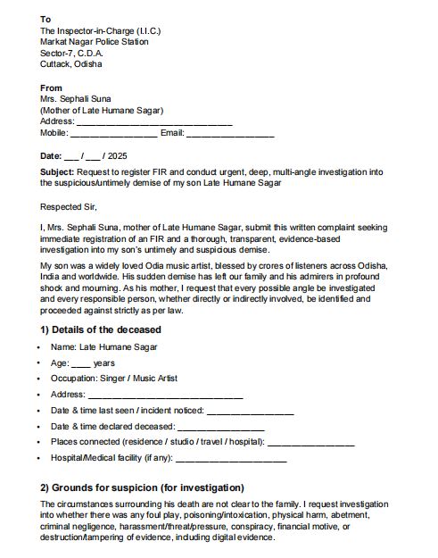 କଣ୍ଠଶିଳ୍ପୀ ହ୍ୟୁମାନ ସାଗର ମୃତ୍ୟୁ ମାମଲାରେ ଥାନାରେ ଏତଲା ଦେଲେ ହ୍ୟୁମାନଙ୍କ ମାଆ ଶେଫାଳୀ ସୁନା । କଟକ ମର୍କତ ନଗର ଥାନାରେ ଏତଲା ଦେଲେ ହ୍ୟୁମାନଙ୍କ ମାଆ । ପୁଅକୁ ନିର୍ଯାତନା ଦିଆଯାଇଥିବା ଅଭିଯୋଗ କଲେ ହ୍ୟୁମାନଙ୍କ ମାଆ ।ହ୍ୟୁମାନଙ୍କ ସନ୍ଦେହଜନକ ମୃତ୍ୟୁର ତଦନ୍ତ ଦାବି କରି ଥାନାରେ ଏତଲା ଦିଆଯାଇଥିବା ଜଣାପଡ଼ିଛି । ମୃତ୍ୟୁର କାରଣ ସ୍ପଷ୍ଟ ହୋଇ ନଥିବା ଏତଲାରେ ଉଲ୍ଲେଖ ରହିଛି । ତାଙ୍କ ଅଭିଯୋଗରେ ହ୍ୟୁମାନଙ୍କ ମୃତ୍ୟୁକୁ ସନ୍ଦେହଜନକ ବୋଲି ବର୍ଣ୍ଣନା କରିଛନ୍ତି ଏବଂ ପୋଲିସକୁ ଏକ ପୁଙ୍ଖାନୁପୁଙ୍ଖ ତଦନ୍ତ କରିବାକୁ ଅନୁରୋଧ କରିଛନ୍ତି ଯାହା ଦ୍ୱାରା କୌଣସି ପ୍ରକାରର ଭୁଲ ହେବାର ସମ୍ଭାବନାକୁ ଏଡାଇବା ପାଇଁ ସେ ଅନୁରୋଧ କରିଛନ୍ତି। ମାମଲାର ସମସ୍ତ ଦିଗକୁ ଯାଞ୍ଚ କରିବାକୁ ଏବଂ ଆଇନ ଅନୁଯାୟୀ ପ୍ରତ୍ୟକ୍ଷ କିମ୍ବା ପରୋକ୍ଷ ଭାବରେ ଦାୟୀ ଥିବା ଯେକୌଣସି ବ୍ୟକ୍ତିଙ୍କ ବିରୁଦ୍ଧରେ କାର୍ଯ୍ୟାନୁଷ୍ଠାନ ଗ୍ରହଣ କରିବାକୁ ସେ ନିବେଦନ କରିଛନ୍ତି। ହ୍ୟୁମାନଙ୍କ ମାଆ ନିଜ ଏତଲାରେ ଦର୍ଶାଇଛନ୍ତି ଯେ ତାଙ୍କ ପୁଅକୁ ନିର୍ଯାତନା ଦିଆଯାଇଛି। ହ୍ୟୁମାନଙ୍କ ସନ୍ଦେହଜନକ ମୃତ୍ୟୁର ତଦନ୍ତ ଦାବି କରି ସେ ଏତଲା ଦେଇଛନ୍ତି। ଏହି ଏତଲାରେ ମୃତ୍ୟୁର କାରଣ ସ୍ପଷ୍ଟ ଯଦିଓ ଲଲ୍ଲେଖ କରାଯାଇନାହିଁ ତେବେ ଅବହେଳା, ଦୁର୍ବ୍ୟବହାର, ଚାପ, ବିଷକ୍ରିୟା, ନିଶାଦ୍ରବ୍ୟ ପ୍ରୟୋଗର ତଦନ୍ତ ଦାବି କରିଛନ୍ତି ହ୍ୟୁମାନଙ୍କ ମା’। ଏଥିସହିତ ଷଡ଼ଯନ୍ତ୍ର, ଆର୍ଥିକ ହେରଫେର୍, ଡିଜିଟାଲ ପ୍ରମାଣ ନଷ୍ଟ ସମ୍ପର୍କିତର ମଧ୍ୟ ତଦନ୍ତ ଦାବି କରି ଏତଲା ଦେଇଛନ୍ତି। ଏହି ଏତଲାରେ ହ୍ୟୁମାନଙ୍କ ମ୍ୟାନେଜର, ପତ୍ନୀ ଶ୍ରେୟା ଓ ତାଙ୍କ ପରିବାର ଏବଂ ଅର୍ପିତା ଚୌଧୁରୀଙ୍କ ବିରୁଦ୍ଧରେ ସଂଗୀନ ଅଭିଯୋଗ ହୋଇଛି। ହ୍ୟୁମେନ୍ ସାଗର ନଭେମ୍ବର ୧୭ ତାରିଖରେ ଭୁବନେଶ୍ୱର ଏମ୍ସରେ ବିଭିନ୍ନ ସ୍ୱାସ୍ଥ୍ୟ ଜଟିଳତା ପାଇଁ ଚିକିତ୍ସାଧୀନ ଥିବା ସମୟରେ ୩୬ ବର୍ଷ ବୟସରେ ଦେହାନ୍ତ କରିଥିଲେ। ତାଙ୍କର ଅକାଳ ମୃତ୍ୟୁ ସାରା ରାଜ୍ୟରେ ଶୋକର ଛାୟା ଖେଳିଯାଇଥିଲା, ଯାହା ପ୍ରଶଂସକ ଏବଂ ସଙ୍ଗୀତ ଜଗତର ସଦସ୍ୟମାନଙ୍କୁ ଗଭୀର ଶୋକରେ ପକାଇ ଦେଇଥିଲା। Post navigation Train Fare Hike: ଡିସେମ୍ବର ୨୬ରୁ ବଢ଼ିବ ଟ୍ରେନ ଭଡ଼ା