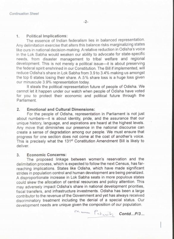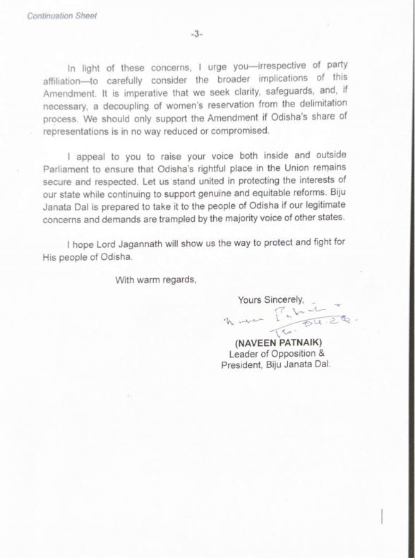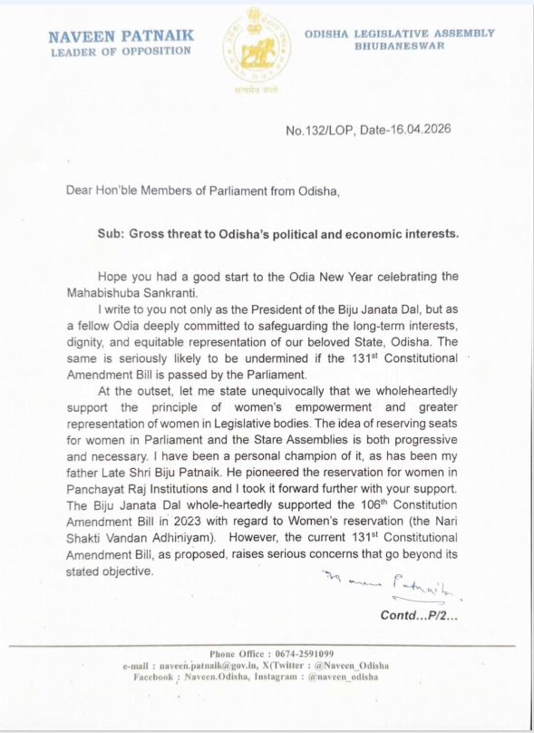 କେନ୍ଦ୍ର ସରକାରଙ୍କ ସୀମା ପୁନଃନିର୍ଦ୍ଧାରଣ ବିଲକୁ ଜୋରଦାର ବିରୋଧ କରିଛି । ଏହାକୁ ନେଇ ରାଜ୍ୟର ସବୁ ସାଂସଦଙ୍କୁ ଚିଠି ଲେଖିଛନ୍ତି ବିଜେଡି ସୁପ୍ରିମୋ ନବୀନ ପଟ୍ଟନାୟକ । ୧୩୧ତମ ସମ୍ବିଧାନ ସଂଶୋଧନ ପ୍ରସଙ୍ଗ ଉଠାଇ ଚିଠି ଲେଖିଥିବା ଜଣାପଡ଼ିଛି । ରାଜ୍ୟର ସ୍ୱାର୍ଥ ପାଇଁ ସଂସଦରେ ମଧ୍ୟ ଏହାକୁ ବିରୋଧ କରିବାକୁ ସମସ୍ତ ଦଳର ସାଂସଦ ମାନଙ୍କୁ ଚିଠି ଲେଖିଛନ୍ତି ବିରୋଧୀ ଦଳ ନେତା ନବୀନ ପଟ୍ଟନାୟକ । ନବୀନ ଚିଠିରେ ଉଲ୍ଲେଖ କରିଛନ୍ତି ଯେ ଯଦି ୧୩୧ତମ ସମ୍ବିଧାନ ସଂଶୋଧନ ବିଲ୍ ସଂସଦରେ ଗୃହୀତ ହୁଏ, ତେବେ ଓଡ଼ିଶାର ଦୀର୍ଘକାଳୀନ ସ୍ୱାର୍ଥ, ଗୌରବ ଏବଂ ସମାନ ଗମ୍ଭୀର ଭାବରେ କ୍ଷୁର୍ଣ୍ଣ ହେବାର ସମ୍ଭାବନା ଅଛି । ମହିଳା ସଶକ୍ତିକରଣ ଏବଂ ବିଧାନସଭାରେ ମହିଳାମାନଙ୍କର ଅଧିକ ପ୍ରତିନିଧିତ୍ୱ ନୀତିକୁ ପୂର୍ଣ୍ଣ ହୃଦୟରେ ସମର୍ଥନ କରୁଛୁ । ସଂସଦ ଏବଂ ବିଧାନସଭାରେ ମହିଳାମାନଙ୍କ ପାଇଁ ସ୍ଥାନ ସଂରକ୍ଷଣର ଧାରଣା ପ୍ରଗତିଶୀଳ ଏବଂ ଆବଶ୍ୟକ । ୨୦୨୩ରେ ବିଜେଡ଼ି ମହିଳା ସଂରକ୍ଷଣ (ନାରୀ ଶକ୍ତି ବନ୍ଦନ ଅଧିନିୟମ) ସମ୍ପର୍କରେ ୧୦୬ତମ ସମ୍ବିଧାନ ସଂଶୋଧନ ବିଲ୍ କୁ ପୂର୍ଣ୍ଣ ହୃଦୟରେ ସମର୍ଥନ କରିଥିଲା। କିନ୍ତୁ ପ୍ରସ୍ତାବିତ ୧୩୧ତମ ସମ୍ବିଧାନ ସଂଶୋଧନ ବିଲ୍ ଗମ୍ଭୀର ଚିନ୍ତାର କାରଣ ପାଲଟିଛି । ଏହା ରାଜ୍ୟ ଉପରେ ରାଜନୈତିକ, ସାଂସ୍କୃତିକ ଓ ଆର୍ଥିକ ପ୍ରଭାବ ପକାଇବ । ଲୋକସଭାରେ ଓଡ଼ିଶାର ସ୍ୱର ଆପେକ୍ଷିକ ହ୍ରାସ ପାଇବ । ବିପର୍ଯ୍ୟୟ ପରିଚାଳନା ଠାରୁ ଆରମ୍ଭ କରି ଆଦିବାସୀ କଲ୍ୟାଣ ଏବଂ ଆଞ୍ଚଳିକ ବିକାଶ ପର୍ଯ୍ୟନ୍ତ ରାଜ୍ୟ-ନିର୍ଦ୍ଦିଷ୍ଟ ଆବଶ୍ୟକତା ପାଇଁ ସମର୍ଥନ କରିବାର ଆମର କ୍ଷମତାକୁ ଦୁର୍ବଳ କରିଦେବ। ଏହା କେବଳ ଏକ ରାଜନୈତିକ ପ୍ରସଙ୍ଗ ନୁହେଁ । ଏହା ଆମ ସମ୍ବିଧାନରେ ନିହିତ ସଂଘୀୟ ଭାବନାକୁ ସଂରକ୍ଷଣ କରିବା ପ୍ରସଙ୍ଗ ଅଟେ । ଯଦି ଏହି ବିଲ୍ କାର୍ଯ୍ୟକାରୀ ହୁଏ, ତେବେ ଲୋକସଭାରେ ଓଡ଼ିଶାର ଅଂଶ ୩.୯ ରୁ ୩.୪%କୁ ହ୍ରାସ ପାଇବ ଏବଂ ଆମକୁ ସେମାନଙ୍କର ଅଂଶ ହରାଇଥିବା ଶ୍ରେଷ୍ଠ ୬ଟି ରାଜ୍ୟ ମଧ୍ୟରେ ସାମିଲ କରାଯିବ । ଆଜି ଆମର ସର୍ବନିମ୍ନ ୩.୯% ପ୍ରତିନିଧିତ୍ୱକୁ ଦେଖିଲେ ୫ ପ୍ରତିଶତ ଅଂଶ ହ୍ରାସ ଏକ ବିରାଟ କ୍ଷତି। ଜାତୀୟ ଆଲୋଚନାରେ ଆମର ଉପସ୍ଥିତିକୁ ହ୍ରାସ କରୁଥିବା ଯେକୌଣସି ପଦକ୍ଷେପ ଆମ ଲୋକଙ୍କ ମଧ୍ୟରେ ଅବନତିର ଭାବନା ସୃଷ୍ଟି କରିପାରେ। ଜନସଂଖ୍ୟା ନିୟନ୍ତ୍ରଣ ଏବଂ ମାନବ ବିକାଶରେ ଗୁରୁତ୍ୱପୂର୍ଣ୍ଣ ଅଗ୍ରଗତି କରିଥିବା ଓଡ଼ିଶା ଭଳି ରାଜ୍ୟଗୁଡ଼ିକୁ ଦଣ୍ଡିତ କରାଯାଉଛି । ଏହା ଜାତୀୟ ବିକାଶ ପ୍ରାଥମିକତା, ଆର୍ଥିକ ସ୍ଥାନାନ୍ତର ଏବଂ ଭିତ୍ତିଭୂମି ନିବେଶରେ ଓଡ଼ିଶାର ଅଂଶ ଉପରେ ପ୍ରତିକୂଳ ପ୍ରଭାବ ପକାଇବ । ତେଣୁ ଦଳଗତ ନିର୍ବିଶେଷରେ ଏହି ସଂଶୋଧନର ବ୍ୟାପକ ପ୍ରଭାବକୁ ସାବଧାନତାର ସହ ବିଚାର କରିବାକୁ ନବୀନ ଚିଠି ଜରିଆରେ ଅନୁରୋଧ କରିଛନ୍ତି । ସ୍ପଷ୍ଟତା, ସୁରକ୍ଷା ଏବଂ ଆବଶ୍ୟକ ହେଲେ, ସୀମା ନିର୍ଦ୍ଧାରଣ ପ୍ରକ୍ରିୟାରୁ ମହିଳା ସଂରକ୍ଷଣକୁ ଅଲଗା କରିବା ଅତ୍ୟନ୍ତ ଜରୁରୀ। ଯଦି ଓଡ଼ିଶାର ପ୍ରତିନିଧିତ୍ୱ ଅଂଶ କୌଣସି ପ୍ରକାରେ ହ୍ରାସ ନ ହୁଏ ତେବେ ଆମକୁ ସଂଶୋଧନ ବିଲକୁ ସମର୍ଥନ କରିବାକୁ ପଡ଼ିବ । ଯଦି ଓଡ଼ିଶାର ପ୍ରତିନିଧିତ୍ବ କମୁନି ତାହେଲେ ସଂଶୋଧନକୁ ସମର୍ଥନ ଉଚିତ । କେନ୍ଦ୍ରରେ ଓଡ଼ିଶା ଅଧିକାର ପାଇଁ ସଂସଦ ଭିତରେ ଓ ବାହାରେ ସ୍ବର ଉଠାନ୍ତ
