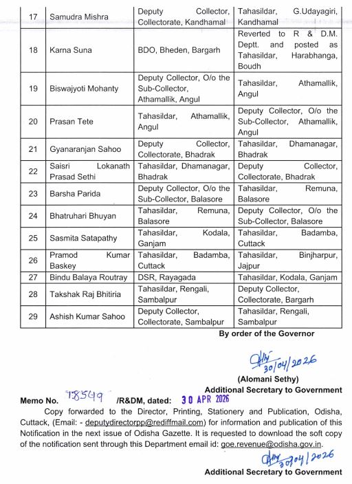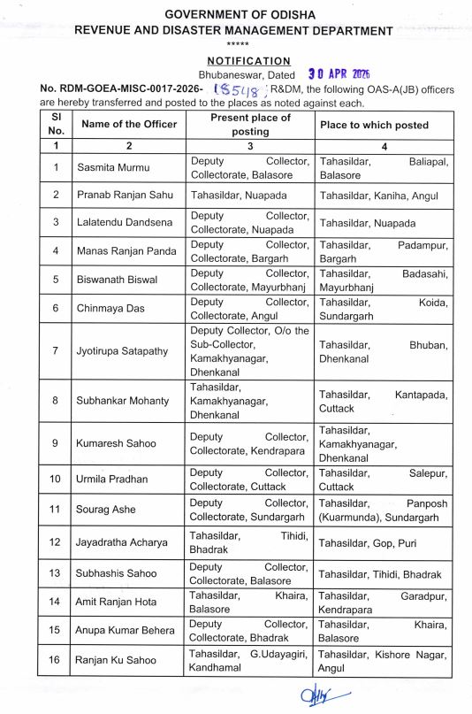 ଓଡିଶା ସରକାର ଏକ ଗୁରୁତ୍ୱପୂର୍ଣ୍ଣ ପ୍ରଶାସନିକ ପୁନର୍ଗଠନରେ ୨୯ ଜଣ ଓଡ଼ିଶା ପ୍ରଶାସନିକ ସେବା (ଓଏଏସ୍) ଅଧିକାରୀଙ୍କୁ ବଦଳି ଏବଂ ପୋଷ୍ଟିଂ ପାଇଁ ନିର୍ଦ୍ଦେଶ ଦେଇଛନ୍ତି। ଗୁରୁବାର ଦିନ ଓଡ଼ିଶା ସରକାର ବିଭିନ୍ନ ଜିଲ୍ଲାରେ ଅନେକ OAS-A(JB) ଅଧିକାରୀଙ୍କ ବଦଳି ଏବଂ ପୋଷ୍ଟିଂ ସହିତ ଏକ ପୁନର୍ଗଠନ ଘୋଷଣା କରିଛନ୍ତି। ୩୦ ଏପ୍ରିଲ ରୁ କାର୍ଯ୍ୟକାରୀ ହୋଇଥିବା ଏହି ପୁନର୍ଗଠନରେ ରାଜ୍ୟ ମଧ୍ୟରେ ଅଧିକାରୀଙ୍କ ପଦବୀରେ ପରିବର୍ତ୍ତନ ଅନ୍ତର୍ଭୁକ୍ତ। ରାଜସ୍ୱ ଏବଂ ବିପର୍ଯ୍ୟୟ ପରିଚାଳନା ବିଭାଗ ଦ୍ୱାରା ଜାରି ଏକ ବିଜ୍ଞପ୍ତି ମାଧ୍ୟମରେ ଏହି ପଦକ୍ଷେପ ଘୋଷଣା କରାଯାଇଛି, ଯାହାର ଲକ୍ଷ୍ୟ ହେଉଛି ରାଜ୍ୟ ସାରା ଶାସନକୁ ସୁଦୃଢ଼ କରିବା ଏବଂ ସେବା ପ୍ରଦାନକୁ ଉନ୍ନତ କରିବା। ସଦ୍ୟତମ ପୁନର୍ଗଠନ ମୁଖ୍ୟତଃ ସବ-କଲେକ୍ଟର, ଡେପୁଟି କଲେକ୍ଟର ଏବଂ ତହସିଲଦାର ଭାବରେ କାର୍ଯ୍ୟ କରୁଥିବା ଅଧିକାରୀମାନଙ୍କୁ ପ୍ରଭାବିତ କରେ। ଏହି ବଦଳିଗୁଡ଼ିକ ବାଲେଶ୍ୱର, ଅନୁଗୁଳ, ବରଗଡ଼, ସୁନ୍ଦରଗଡ଼, କେନ୍ଦ୍ରାପଡ଼ା, ଭଦ୍ରକ, କଟକ, ଗଞ୍ଜାମ, କନ୍ଧମାଳ ଏବଂ ସମ୍ବଲପୁର ସମେତ ଅନେକ ଜିଲ୍ଲାରେ ବ୍ୟାପୀ ରହିଛି। ଅଧିକାଂଶ ଅଧିକାରୀଙ୍କୁ ତହସିଲଦାର ଭୂମିକାରେ ପୁନଃନିଯୁକ୍ତ କରାଯାଇଛି, ଯାହା ସ୍ଥାନୀୟ ସ୍ତରରେ ତୃଣମୂଳ ପ୍ରଶାସନ, ଭୂମି ପରିଚାଳନା ଏବଂ ସାଧାରଣ ସେବା ପ୍ରବେଶକୁ ସୁଦୃଢ଼ କରିବା ଉପରେ ସରକାରଙ୍କ ଧ୍ୟାନକୁ ଉଜ୍ଜ୍ୱଳ କରିଥାଏ। ସରକାରୀ ବିଜ୍ଞପ୍ତି ଅନୁଯାୟୀ, ସସ୍ମିତା ମୁର୍ମୁ: ବାଲେଶ୍ୱର କଲେକ୍ଟୋରେଟ୍ରୁ ବାଲିଆପାଳ ତହସିଲଦାର ଭାବେ ନିଯୁକ୍ତ । ଶୁଭଙ୍କର ମହାନ୍ତି: ଢେଙ୍କାନାଳ କାମାକ୍ଷାନଗରରୁ କଟକ କାଣ୍ଟାପଡ଼ା ତହସିଲଦାର ଭାବେ ବଦଳି । କୁମାରେଶ ସାହୁ: କେନ୍ଦ୍ରାପଡ଼ା କଲେକ୍ଟୋରେଟ୍ରୁ କାମାକ୍ଷାନଗର ତହସିଲଦାର ଭାବେ ନିଯୁକ୍ତ । ଉର୍ମିଳା ପ୍ରଧାନ: କଟକ କଲେକ୍ଟୋରେଟ୍ରୁ ସାଲେପୁର ତହସିଲଦାର ଭାବେ ଦାୟିତ୍ୱ ଗ୍ରହଣ କରିବେ । ସସ୍ମିତା ଶତପଥୀ: ଗଞ୍ଜାମ କୋଦଳାରୁ କଟକ ବାଡ଼ମ୍ବା ତହସିଲଦାର ଭାବେ ବଦଳି । ଜୟଦରଥ ଆଚାର୍ଯ୍ୟ: ଭଦ୍ରକ ତିହିଡ଼ିରୁ ପୁରୀ ଗୋପ ତହସିଲଦାର ଭାବେ ନିଯୁକ୍ତ ୭ ଦିନ ମଧ୍ୟରେ କାର୍ଯ୍ୟରେ ଯୋଗଦେବାକୁ ନିର୍ଦ୍ଦେଶ: ବିଭିନ୍ନ ଜିଲ୍ଲାର ଜିଲ୍ଲାପାଳ ଏବଂ ଅଧିକାରୀମାନଙ୍କୁ ନିର୍ଦ୍ଦେଶ ଦିଆଯାଇଛି ଯେ, ସମ୍ପୃକ୍ତ ଓଏଏସ୍ ଅଧିକାରୀମାନଙ୍କୁ ୭ ଦିନ ମଧ୍ୟରେ କାର୍ଯ୍ୟମୁକ୍ତ କରାଯାଉ, ଯାହାଦ୍ୱାରା ସେମାନେ ନିଜର ନୂତନ ନିଯୁକ୍ତି ସ୍ଥାନରେ ଯୋଗ ଦେଇପାରିବେ । ଏଥିସହ ସବ୍-କଲେକ୍ଟର ଏବଂ ଡେପୁଟି କଲେକ୍ଟର ଅଫିସରେ ବୃଦ୍ଧି ପାଇଁ ଅନେକ ଅଧିକାରୀଙ୍କୁ ପୁନଃ ନିଯୁକ୍ତ କରାଯାଇଛି ଜିଲ୍ଲା ସ୍ତରରେ ପ୍ରଶାସନିକ ସମନ୍ୱୟ। ପ୍ରଶାସନିକ ପଦକ୍ଷେପର ଲକ୍ଷ୍ୟ ଶାସନ ବ୍ୟବସ୍ଥାରେ ଉନ୍ନତି ଆଣିବା। ରାଜସ୍ୱ ଏବଂ ବିପର୍ଯ୍ୟୟ ପରିଚାଳନା ବିଭାଗ କହିଛି ଯେ ଏହି ପୁନର୍ଗଠନ ଏକ ନିୟମିତ ପ୍ରଶାସନିକ ପ୍ରକ୍ରିୟାର ଅଂଶ ଯାହା ଶାସନରେ ଦକ୍ଷତା, ସ୍ୱଚ୍ଛତା ଏବଂ ଦାୟିତ୍ୱ ସୁନିଶ୍ଚିତ କରିବା ପାଇଁ ଡିଜାଇନ୍ କରାଯାଇଛି। ଏହିପରି ସ୍ଥାନାନ୍ତରଗୁଡ଼ିକ ଅଧିକାରୀମାନଙ୍କର ନିୟୋଜନକୁ ଉନ୍ନତ କରିବା, ବିଭାଗ ମଧ୍ୟରେ ସମନ୍ୱୟ ଉନ୍ନତ କରିବା ଏବଂ ବିପର୍ଯ୍ୟୟ ପ୍ରସ୍ତୁତି ଏବଂ ଭୂମି ପ୍ରଶାସନ ବ୍ୟବସ୍ଥାକୁ ସୁଦୃଢ଼ କରିବା ପାଇଁ ଉଦ୍ଦିଷ୍ଟ। ଭୁବନେଶ୍ୱରରୁ ଜାରି ହ