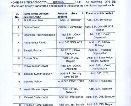 ଓପିଏସ୍ ସ୍ତରରେ ଅଦଳବଦଳ କଲେ ରାଜ୍ୟ ସରକାର । ରାଜ୍ୟର ମୋଟ୍ ୧୯ ଜଣ ଅତିରିକ୍ତ ଏସପିଙ୍କର ଆଜି ବଦଳି କରାଯାଇଛି। ବଦଳିଲେ ବ୍ରହ୍ମପୁର ଅତିରିକ୍ତ ଏସ୍ପି । ବ୍ରହ୍ମପୁର ଅତିରିକ୍ତ ଏସ୍ପି ସୀମା ସ୍ବାଇଁଙ୍କ ବଦଳି କରାଯାଇଛି । ତାଳଚେର ଅତିରିକ୍ତ ଏସ୍ପି ଭାବେ ସୀମା ସ୍ବାଇଁଙ୍କ ବଦଳି କରାଯାଇଥିବା ବେଳେ ବଲାଙ୍ଗୀର ଅତିରିକ୍ତ ଏସପି ଆଲୋକ କୁମାର ଜେନା ପୁଣି ଥରେ ବ୍ରହ୍ମପୁରକୁ ଫେରିଛନ୍ତି । ଏନେଇ ଗୃହ ବିଭାଗ ପକ୍ଷରୁ ସୂଚନା ଦିଆଯାଇଛି । ସେହିପରି ବରଗଡ଼ ଅତିରିକ୍ତ ଏସପି ଇନ୍ଦୁରେଖା ପଶ୍ଚିମକବାଟଙ୍କୁ ଢେଙ୍କାନାଳର ଦାୟିତ୍ୱ ହସ୍ତାନ୍ତର କରାଯାଇଛି । ଅତିରିକ୍ତ ଏସପି ଅମ୍ରିତ କୁମାର ପଣ୍ଡା ବଲାଙ୍ଗୀରକୁ ବଦଳି ହୋଇଛନ୍ତି । ଭୁବନେଶ୍ବରର ଅତିରିକ୍ତ ଏସପି ସଞ୍ଜୀବ କୁମାର ଶତପଥୀଙ୍କୁ ଆଡିସନାଲ ଏସପି ସ୍ପେଶାଲ ଟାକ୍ସଫୋର୍ସ ଭାବେ ଦାୟିତ୍ବ ଦିଆଯାଇଛି । ଏହା ସହ ଭିଜିଲାନ୍ସ ଅତିରିକ୍ତ ଏସପି ହୋଇଛନ୍ତି ସ୍ୱସ୍ତିକ ପଣ୍ଡା, ସସ୍ମିତା ସାହୁ, ଅଶ୍ୱିନୀ କୁମାର ନାୟକ, ହରପ୍ରିୟା ନାୟକ । କଟକ ASP ସତ୍ୟବିକାଶ ଭୂୟାଁଙ୍କୁ ଭଦ୍ରକ ବଦଳି କରାଯାଇଛି । ସମ୍ବଲପୁରର ଅତିରିକ୍ତ ଏସପି ପ୍ରକାଶ କୁମାର ଟପ୍ପୋଙ୍କୁ ରାଉରକେଲା ବଦଳି କରାଯାଇଥିବା ବେଳେ ବରଗଡ଼ ଡିଆଇବି ଅତିରିକ୍ତ ଏସପି ସୌରଭ ଓଟ୍ଟା କଟକ ପୋଲିସ ମୁଖ୍ୟ କାର୍ଯ୍ୟାଳୟକୁ ବଦଳି ହୋଇଛନ୍ତି । Post navigation କାଲି ବଜ୍ରପାତରେ ମନ୍ଦିର ପତାକା ପୋଡ଼ିଯିବା ଘଟଣା; ଲିଙ୍ଗରାଜ ମନ୍ଦିରରେ ଏଏସ୍ଆଇ ଟିମ୍ ବିଜେଡି ଛାଡି କଂଗ୍ରେସରେ ଯୋଗ ଦେଲେ ମହେଶ ନିଆଲ