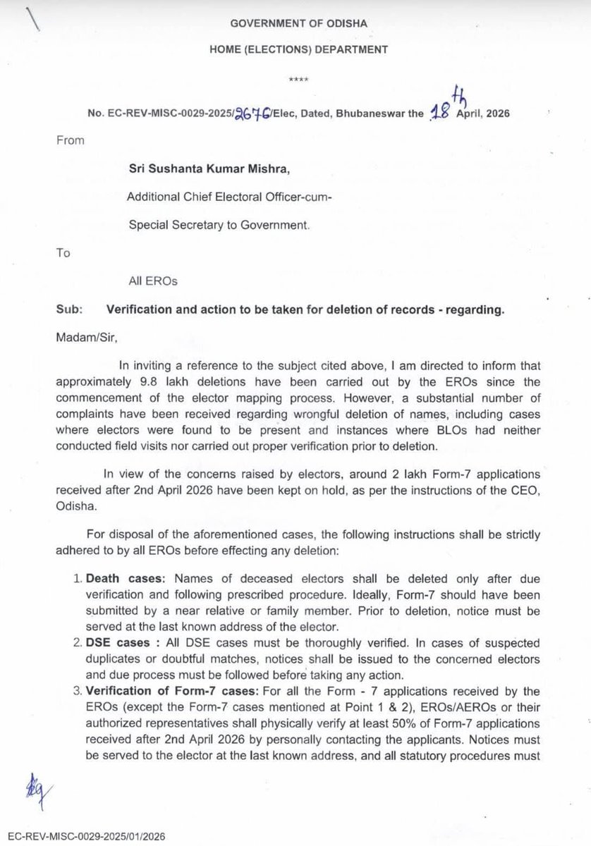 ବାଦ୍ ପଡ଼ିଥିବା ଭୋଟରଙ୍କୁ ଯାଞ୍ଚ ନିର୍ଦ୍ଦେଶ । ଭୋଟର ତାଲିକାରୁ ୯.୮ ଲକ୍ଷ ନାଁ କଟିବା ପରେ ଗୃହ ବିଭାଗର କଡ଼ା ନିର୍ଦ୍ଦେଶ ।ଜୀବିତ ଏବଂ ସ୍ଥାନୀୟ ଭୋଟରଙ୍କ ନାମ ଭୁଲବଶତଃ କାଟି ଦିଆଯାଇଥିବା ନେଇ ଅନେକ ଅଭିଯୋଗ ଆସିବା ପରେ ଏହି ପଦକ୍ଷେପ ନିଆଯାଇଛି। ଏହାକୁ ଗୁରୁତ୍ୱର ସହିତ ବିଚାର କରି ବିଭାଗ ନିର୍ବାଚନ ପଞ୍ଜିକରଣ ଅଧିକାରୀ (EROs)ଙ୍କୁ ନିର୍ଦ୍ଦେଶ ଦେଇଛି ଯେ ଉପଯୁକ୍ତ ଯାଞ୍ଚ ବିନା କୌଣସି ନାମ ବାଦ ନ ଦିଆଯାଏ। ନିର୍ଦ୍ଦେଶ ଅନୁଯାୟୀ, ମୃତ ଭୋଟରଙ୍କ ନାମ ସମ୍ପୂର୍ଣ୍ଣ ଯାଞ୍ଚ ପରେ ହିଁ ବାଦ ଦିଆଯିବା ଉଚିତ୍, ପରିବାର ସଦସ୍ୟ କିମ୍ବା ନିକଟ ସମ୍ପର୍କୀୟଙ୍କ ଦ୍ୱାରା ଫର୍ମ ୭ ଦାଖଲ କରିବାକୁ ପଡିବ। ଯଦି ସେମାନଙ୍କ ନାମ ବାଦ ଦିଆଯାଏ ତେବେ ଭୋଟରମାନଙ୍କୁ ସେମାନଙ୍କ ପଞ୍ଜିକୃତ ଠିକଣାରେ ଜଣାଇବାକୁ କର୍ତ୍ତୃପକ୍ଷଙ୍କୁ ନିର୍ଦ୍ଦେଶ ଦିଆଯାଇଛି। ରାଜ୍ୟ ଅନୁଷ୍ଠିତ ଇଲେକ୍ଟର ମ୍ୟାପିଂ ପ୍ରକ୍ରିୟା ପରଠାରୁ ଉପରେ ଇଆରଓଙ୍କ ଦ୍ୱାରା ପ୍ରାୟ ୯ ଲକ୍ଷ ୮୦ ହଜାର ଜଣ ମତଦାତାଙ୍କ ନାମ ବାଦ ଦିଆଯାଇଛି । ଏଭଳି ଅନେକ ଲୋକେ ଜୀବିତ ଥିବାବେଳେ ସେମାନଙ୍କ ନାମ ମତଦାତା ତାଲିକାରୁ ବାଦ ପଡ଼ିଥିବା ଅଭିଯୋଗ ହୋଇଛି । ଯାହାକୁ ନେଇ ଗୃହ ନିର୍ବାଚନ ବିଭାଗ ଉଦବେଗ ପ୍ରକାଶ କରିଛି । ବିଏଲଓମାନେ ଘରକୁ ଘରକୁ ନ ବୁଲି କିମ୍ବା ସଠିକ୍ ଯାଞ୍ଚ ନ କରିନଥିବା ଅଭିଯୋଗ ହୋଇଛି । ଭୋଟରମାନଙ୍କ ଦ୍ୱାରା ଉଠାଯାଇଥିବା ଚିନ୍ତାକୁ ଦୃଷ୍ଟିରେ ରଖି ସିଇଓଙ୍କ ୨ ଏପ୍ରିଲ ୨୦୨୬ ପରଠାରୁ ମିଳିଥିବା ପ୍ରାୟ ୨ ଲକ୍ଷ ଫର୍ମ-୭ ଆବେଦନକୁ ସ୍ଥଗିତ ରଖିବାକୁ ନିଷ୍ପତ୍ତି ନେଇଛନ୍ତି । ତେଣୁ ପୁଣି ଥରେ କ୍ଷେତ୍ର ପରିଦର୍ଶନ କରିବାକୁ ସମସ୍ତ ଇଆରଓଙ୍କୁ ସିଇଓ କଡ଼ା ନିର୍ଦ୍ଦେଶ ଦେଇଛନ୍ତି । ଯାଞ୍ଚ ସମୟରେ ମୃତ୍ୟୁ ମାମଲା, ଡିଏସଇ ଏବଂ ଫର୍ମ-୭ ଆବେଦନକୁ ଭଲ ଭାବେ ଧ୍ୟାନରେ ରଖିବେ । ସେହିପରି ସମସ୍ତ ଡିଏସଇ ମାମଲାଗୁଡ଼ିକୁ ପୁଙ୍ଖାନୁପୁଙ୍ଖ ଭାବରେ ଯାଞ୍ଚ କରିବେ ଆବଶ୍ୟକ। ସନ୍ଦେହଜନକ ନକଲ କିମ୍ବା ସନ୍ଦେହଜନକ ମେଳକ କ୍ଷେତ୍ରରେ, ସମ୍ପୃକ୍ତ ଭୋଟରମାନଙ୍କୁ ନୋଟିସ୍ ଜାରି କରାଯିବ ଏବଂ କୌଣସି କାର୍ଯ୍ୟନୁଷ୍ଠାନ ନେବା ପୂର୍ବରୁ ଉପଯୁକ୍ତ ପ୍ରକ୍ରିୟା ଅନୁସରଣ କରିବେ । ସେହିପରି ଫର୍ମ-୭ ମାମଲାଗୁଡ଼ିକର ଯାଞ୍ଚ ସମଯରେ ଇଆରଓଏସ୍ ଦ୍ୱାରା ପ୍ରାପ୍ତ ସମସ୍ତ ଫର୍ମ-୭ ଆବେଦନ ପାଇଁ (ପଏଣ୍ଟ ୧ ଏବଂ ୨ ବ୍ୟତୀତ) ଅଧିକୃତ ପ୍ରତିନିଧିମାନେ ଆବେଦନକାରୀଙ୍କ ସହିତ ବ୍ୟକ୍ତିଗତ ଭାବରେ ଯୋଗାଯୋଗ କରିବେ । ଏହା ସହିତ ୨ ଏପ୍ରିଲ ୨୦୨୬ ପରେ ପ୍ରାପ୍ତ ଫର୍ମ-୭ ଆବେଦନଗୁଡ଼ିକର ଅତି କମରେ ୫୦% ଶାରୀରିକ ଭାବରେ ଯାଞ୍ଚ କରିବେ । ଶେଷ ଜଣାଶୁଣା ଠିକଣାରେ ଭୋଟରଙ୍କୁ ନୋଟିସ୍ ପ୍ରଦାନ କରାଯିବ ଏବଂ ସମସ୍ତ ବୈଧାନିକ ପ୍ରକ୍ରିୟାଗୁଡ଼ିକ ନିଶ୍ଚିତ କରିବାକୁ ସିଇଓ ନିର୍ଦ୍ଦେଶ ଦେଇଛନ୍ତି । Post navigation Sijimali hill tensions: ସିଜିମାଲି ଅଶାନ୍ତି ଉପରେ କେନ୍ଦ୍ରର ହସ୍ତକ୍ଷେପ ପାଇଁ ଅନୁରୋଧ କଲେ ସାଂସଦ ମାଳବିକା ଦେବୀ Bus Accident In Jammu And Kashmir: ଜମ୍ମୁ କଶ୍ମୀରରେ ୧୦୦ ଫୁଟ ତଳକୁ ଖସିଲା ଯାତ୍ରୀବାହୀ; ୧୫ ମୃତ