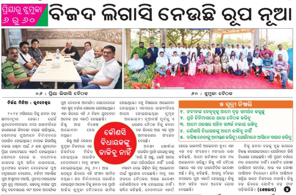 ୨୦୨୪ ମସିହାରେ ବିଜୁ ଜନତା ଦଳ କ୍ଷମତାଚ୍ଯୁତ ହେଲା। ଯେଉଁ ଯୁବନେତାମାନଙ୍କର ବାପା ରାଜନୀତିରେ ଜଣେଜଣେ କିମ୍ବଦନ୍ତୀ ନାୟକ ସାଜିଥିଲେ, ସେମାନଙ୍କ ପୁଅମାନେ ନିର୍ବାଚନରେ ପରାଜିତ ହୋଇଥିଲେ । ବାପାଙ୍କ ଲିଗାସିକୁ ବଜାୟ ରଖିବା ପାଇଁ ୬ ଜଣ ଯୁବନେତା ପ୍ରିୟା ହୋଟେଲରେ ଏକାଠି ହୋଇଥିଲେ। ସେମାନେ ହେଲେ ଡ. ଦାମୋଦର ରାଉତଙ୍କ ପୁଅ ସଜ୍ଜିତ ରାଉତରାୟ, ପ୍ରଫେସର କାଳନ୍ଦୀ ବେହେରାଙ୍କ ପୁଅ ଚନ୍ଦ୍ରସାରଥୀ ବେହେରା, ନଳିନୀ ମହାନ୍ତିଙ୍କ ପୁଅ ଅଂଶୁମାନ ମହାନ୍ତି, ପ୍ରଦୀପ ମହାରଥୀଙ୍କ ପୁଅ ରୁଦ୍ର ମହାରାଥୀ, କଳ୍ପତରୁ ଦାସଙ୍କ ପୁଅ ଜିତୁ ବଳବନ୍ତରାୟ ଏବଂ ଆନନ୍ଦ ଆଚାର୍ଯ୍ୟଙ୍କ ପୁଅ ଦେବେଶ ଆଚାର୍ଯ୍ୟ। ସେତେବେଳେ ଏହା ଖୁବ୍ ଚର୍ଚ୍ଚାର ଖୋରାକ ଯୋଗାଇଥିଲା। ଏହା ଭିତରେ ଏହି ୬ ବିଜଦ ଯୁବନେତା ଅନେକ ଥର ଏକାଠି ହୋଇଛନ୍ତି । କିନ୍ତୁ ଆଉ ବିଶେଷ ଆଲୋଚନା ହେଉ ନଥିଲା। କିନ୍ତୁ କାଲି ଚନ୍ଦକାର ଝୁମୁକା ନିକଟରେ ଏକ ରିସର୍ଟରେ ମିଳିତ ହୋଇଥିଲେ ପରାଜିତ ନେତାମାନେ । ମାତ୍ର ସଂଖ୍ୟା ହୋଇଯାଇଥିଲା ୬ରୁ ୬୦ । ଆଉ ଉପକୂଳ ଭିତରେ ଏହି ସଂଖ୍ୟା ସୀମିତ ନଥିଲା । ଗତ ନିର୍ବାଚନରେ ପରାଜିତ ହୋଇଥିବା ଅନେକ ବିଜୁ ଜନତା ଦଳ ପ୍ରାର୍ଥୀ କାଲି ଝୁମୁକା ବୈଠକରେ ସାମିଲ ହୋଇଥିଲେ । ବହୁ ବିଷୟରେ ଆଲୋଚନା ହୋଇଥିଲା। ଏହାପରେ ରାଜନୀତିରେ ଆରମ୍ଭ ହୋଇଯାଇଥିଲା ତୁମୂଳ ଆଲୋଡ଼ନ । ନୂଆବର୍ଷ ପୂର୍ବରୁ ଏ ଧରଣର ବୈଠକ ବିଜୁ ଜନତା ଦଳ ଭିତରେ ଆଉ ଏକ ନୂଆ ସମୀକରଣର ସଂକେତ ଦେଉଛି । ଅବଶ୍ୟ ଖୋର୍ଦ୍ଧାର ପରାଜିତ ପ୍ରାର୍ଥୀ ରାଜେନ୍ଦ୍ର ସାହୁ ‘ହାରି କି ଅଛୁ, କେହି ଆମର ବଙ୍କା ପରିପାରିବେ ନାହିଁ ବୋଲି ମନ୍ତବ୍ୟ ଦେଇ କିଛିଟା ଭିନ୍ନ ଆଲୋଚନା ପାଇଁ ସୁଯୋଗ ଦେଇଛନ୍ତି । ମାତ୍ର ଏହା ଫଳରେ ବୈଠକର ଅସଲ ଉଦ୍ଦେଶ୍ୟ କୌଣସିମତେ ନଷ୍ଟ ହୋଇଯାଇ ନାହିଁ । ସମ୍ବିତ କହିଛନ୍ତି, ନେତାମାନେ ଏକାଠି ହେଲେ ରାଜନୀତି ଆଲୋଚନା ହୁଏ । ଏହା ଏକ ବଢ଼ ସଂକେତ । ମହୀଧର ରଣା କହିଛନ୍ତି, ଆମେ ଭବିଷ୍ୟତ କଥା ମଧ୍ୟ ଆଲୋଚନା କରିଛୁ । କିନ୍ତୁ ଏହି ବୈଠକ ପଛରେ ଏକ ବଡ଼ ରାଜନୈତିକ ଉଦ୍ଦେଶ୍ୟ ଅଛି । ଜିତୁ କହିଛନ୍ତି, ଆଗରୁ ନାଁକଲା ବାପାଙ୍କର ପୁଅ ଏକାଠି ହେଉଥିଲୁ । କିନ୍ତୁ ଆମ ସହିତ ଏବେ ଅନେକ ଯୋଗ ଦେଇଛନ୍ତି । ବିଜୁ ଜନତା ଦଳକୁ ଦୁଇ ଭାଗରେ ବିରକ୍ତ କରାଯାଇପାରେ। ଯେଉଁମାନେ ଜିଣି ବିଧାୟକ ହୋଇଛନ୍ତି । ଏହି ପ୍ରଥମ ବର୍ଗରେ ମଧ୍ୟ ତାଳମେଳ ନାହିଁ । ଗୋଟିଏ ଗୋଷ୍ଠୀ ପାଣ୍ଡିଆନ ସମର୍ଥକ, ଆଉ ଏକ ଗୋଷ୍ଠୀ ପାଣ୍ଡିଆନ ବିରୋଧୀ । ଯଦିଓ ପାଣ୍ଡିଆନ ସକ୍ରିୟ ଭାବେ ବିଜଦରେ ନାହାନ୍ତି । କିନ୍ତୁ ଦଳ ଭିତରେ ଗୋଟିଏ ବଡ଼ ଫାଟ ପଢ଼ି ସାରିଛି । ଦ୍ଵିତୀୟ ବର୍ଗ ହେଲେ ଯେଉଁମାନେ ଗତ ନିର୍ବାଚନରେ ହାରିଛନ୍ତି। ଏବେ ପ୍ରଫୁଲ୍ଲ ଘଡ଼ାଇଙ୍କ ପୁଅ ପ୍ରୀତିରଞ୍ଜନ ଘଡ଼ାଇ ବି ଏହି ଗୃପକୁ ଆସିଛନ୍ତି। ତାଙ୍କ ସହ ଆସିଛନ୍ତି ପୁଷ୍ପେନ୍ଦ୍ର ସିଂହଦେଓ । ଏମାନଙ୍କର ବଳ ବଢ଼ିଛି। ଭବିଷ୍ୟତ ପାଇଁ ଏମାନେ ଚିନ୍ତିତ ମଧ୍ୟ । ୬୦ ଜଣ ପରାଜିତ ପ୍ରାର୍ଥୀଙ୍କ ମନରେ ଗୋଟିଏ ବଡ଼ କ୍ଷୋଭ ରହିଛି ଯେ ଭାଜପା ପାଇଁ ନୁହେଁ ଦଳ ପାଇଁ ସେମାନେ ହାରିଛନ୍ତି। ମଜାର କଥା ହେଉଛି ଏହି ଦ୍ଵିତୀୟ ବର୍ଗର ସଂଖ୍ୟା ପ୍ରଥମ ବର୍ଗଠାରୁ ଅଧିକ। ଏହିମାନେ ବିଜଦ ରାଜନୀତିକୁ ନୂଆ ମୋଡ଼ ଦେଇପାରିବେ। ଝୁମୁକା ବୈଠକରେ ରାଜନୈତିକ ଆଲୋଚନା ହୋଇଛି। ଭୋଜି ଭାତ କରାଯାଇଛି। ତା’ ସହି ସହି