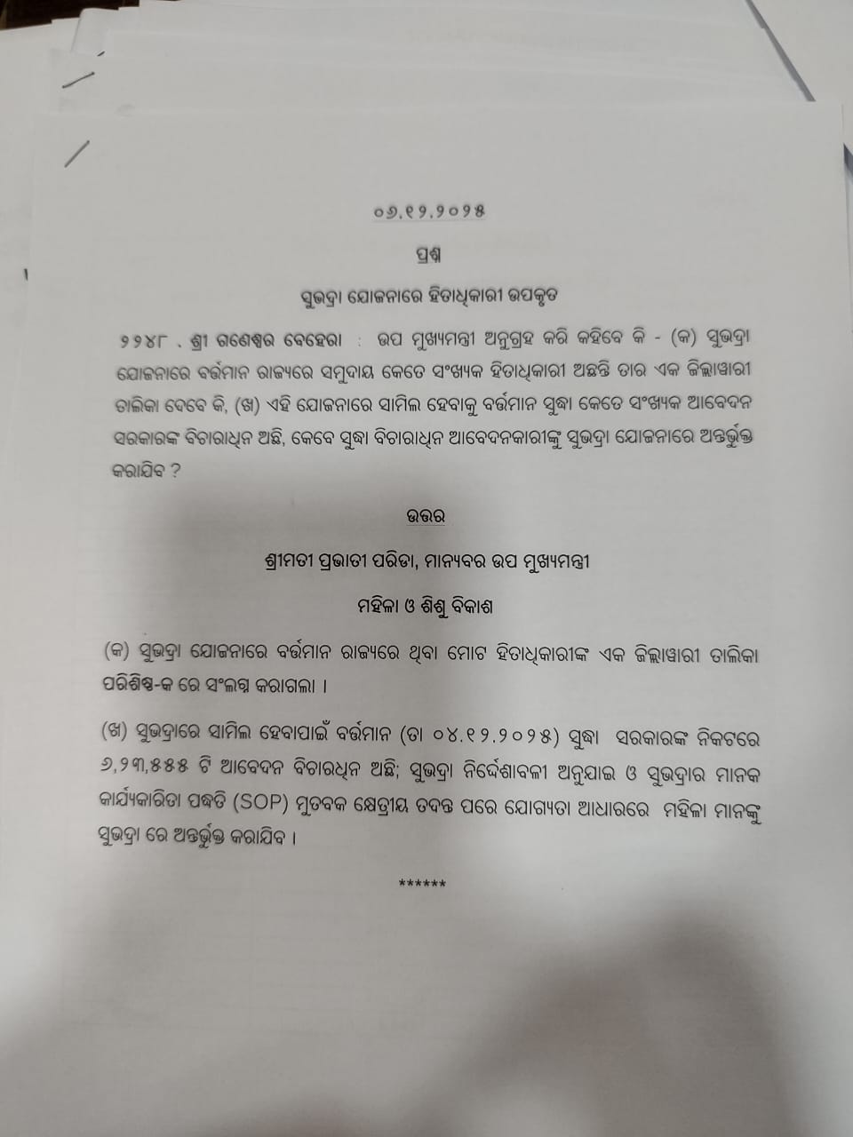 ସୁଭଦ୍ରା ଯୋଜନାରେ ସାମିଲ ହେବା ପାଇଁ ୬ ଲକ୍ଷ ୨୩ ହଜାର ୫୫୫ ହିତାଧିକାରୀଙ୍କ ଆବେଦନ ବିଚାରାଧୀନ ରହିଛି । ୧ କୋଟି ୩୭ ଲକ୍ଷ ୫୯୪୧ ଜଣ ପ୍ରଥମ କିସ୍ତି ପାଇଥିବାବେଳେ ୧ କୋଟି ୧୯ ଲକ୍ଷ ୨୭୨୪ ଜଣ ଦ୍ୱିତୀୟ କିସ୍ତି ପାଇଛନ୍ତି । ୯୭ ଲକ୍ଷ ୬୫ ହଜାର ୩୩୯ ଜଣ ପାଇଛନ୍ତି ତୃତୀୟ କିସ୍ତି । ସୁଭଦ୍ରା ଯୋଜନାରେ କେତେ ହିତାଧିକାରୀ ଉପକୃତ ହୋଇଛନ୍ତି । ବିଜେଡି ବିଧାୟକ ଗଣେଶ୍ୱର ବେହେରା ପଚାରିଥିବା ଏହି ପ୍ରଶ୍ନର ଉତ୍ତର ଦେଇ ବିଧାନସଭାରେ ଉପମୁଖ୍ୟମନ୍ତ୍ରୀ ପ୍ରଭାତୀ ପରିଡା ଏହି ସୂଚନା ଦେଇଛନ୍ତି । କହିରଖୁଛୁ ଯେ, ଆଜି ସୁରୁଖୁରୁରେ ଚାଲିଛି ବିଧାନଭା ଶୀତକାଳୀନ ଅଧିବେଶନ । ଆଜି ପ୍ରଶ୍ନକାଳରେ ମହିଳା ଓ ଶିଶୁ ବିକାଶ, ପର୍ଯ୍ୟଟନ, ଅବକାରୀ ବିଭାଗ, ମିଶନ ଶକ୍ତି ଏବଂ ଆଇନ ବିଭାଗର ପ୍ରଶ୍ନୋତ୍ତର କାର୍ଯ୍ୟକ୍ରମ ଚାଲିଛିି । Post navigation No New Liquor Shops In Odisha: ରାଜ୍ୟରେ ଆଉ ଖୋଲିବନି ନୂଆ ମଦ ଦୋକାନ