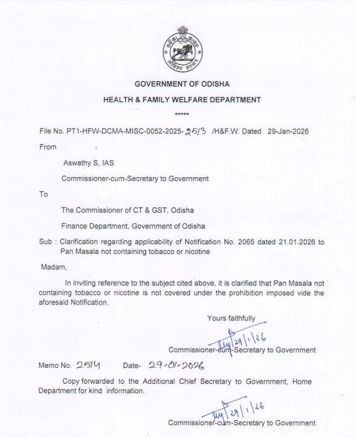 ଚିଠିରେ ସ୍ୱାସ୍ଥ୍ୟ ସଚିବ ଅଶ୍ୱଥି ଏସ, ଆଇଏଏସ ସ୍ପଷ୍ଟ ଭାବରେ କହିଛନ୍ତି ଯେ ଯେଉଁ ପାନ ମସଲା ଉତ୍ପାଦଗୁଡ଼ିକରେ ତମାଖୁ କିମ୍ବା ନିକୋଟିନ ନାହିଁ, ସେଗୁଡ଼ିକ ସାମ୍ପ୍ରତିକ ସରକାରୀ ବିଜ୍ଞପ୍ତି ମାଧ୍ୟମରେ ଲାଗୁ ହୋଇଥିବା ନିଷେଧ ପରିସରଭୁକ୍ତ ନୁହେଁ।