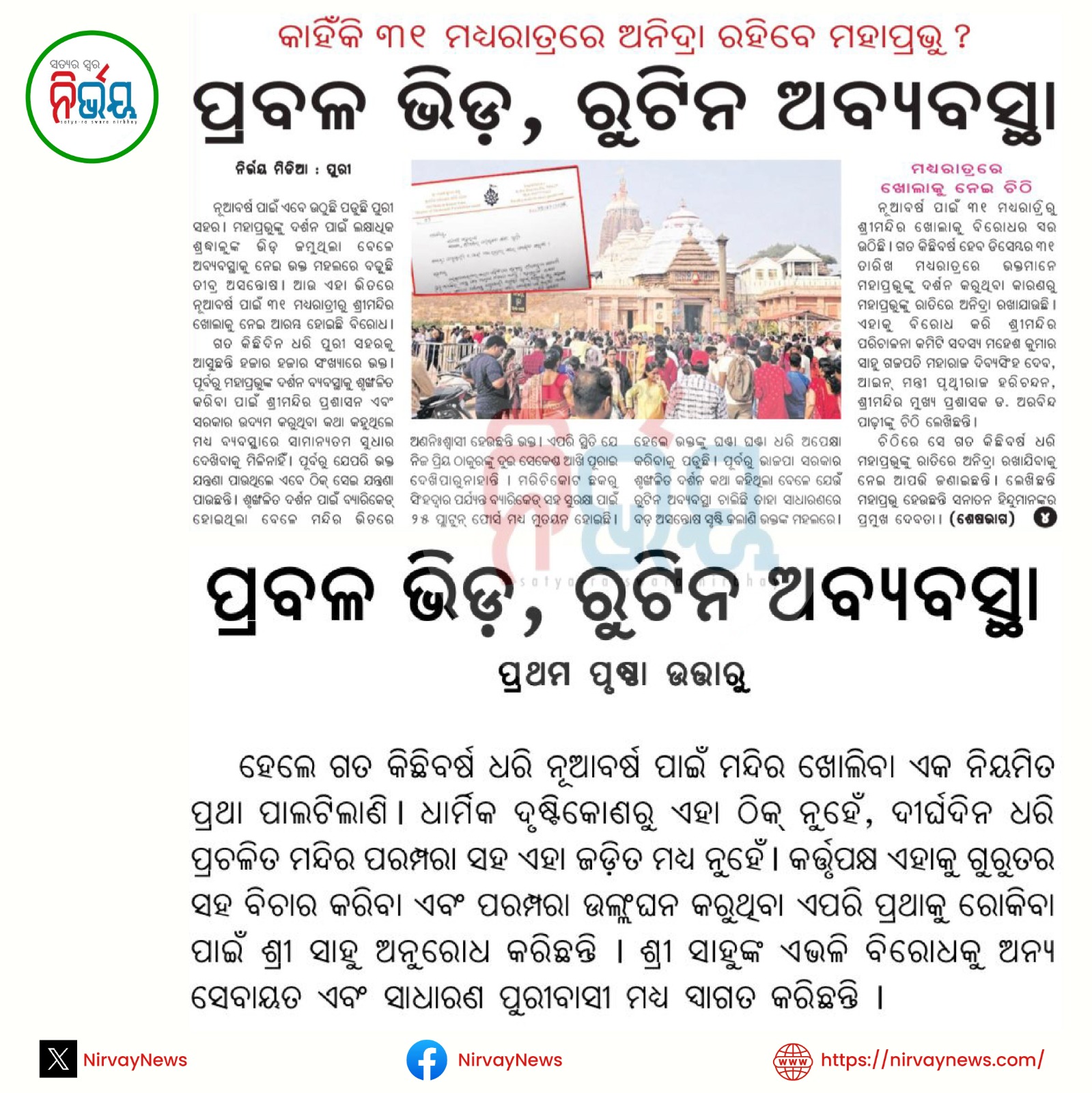 ନୂଆବର୍ଷ ପାଇଁ ଏବେ ଉଠୁଛି ପଡ଼ୁଛି ପୁରୀ ସହର । ମହାପ୍ରଭୁଙ୍କୁ ଦର୍ଶନ ପାଇଁ ଲକ୍ଷାଧିକ ଶ୍ରଦ୍ଧାଳୁଙ୍କ ଭିଡ଼ ଜମୁଥିଲା ବେଳେ ଅବ୍ଯବସ୍ଥାକୁ ନେଇ ଭକ୍ତ ମହଲରେ ବଢୁଛି ତୀବ୍ର ଅସନ୍ତୋଷ । ଆଉ ଏହା ଭିତରେ ନୂଆବର୍ଷ ପାଇଁ ୩୧ ମଧ୍ୟରାତ୍ରୀରୁ ଶ୍ରୀମନ୍ଦିର ଖୋଲାକୁ ନେଇ ଆରମ୍ଭ ହୋଇଛି ବିରୋଧ। ଗତ କିଛିଦିନ ଧରି ପୁରୀ ସହରକୁ ଆସୁଛନ୍ତି ହଜାର ହଜାର ସଂଖ୍ୟାରେ ଭକ୍ତ । ପୂର୍ବରୁ ମହାପ୍ରଭୁଙ୍କ ଦର୍ଶନ ବ୍ୟବସ୍ଥାକୁ ଶୃଙ୍ଖଳିତ କରିବା ପାଇଁ ଶ୍ରୀମନ୍ଦିର ପ୍ରଶାସନ ଏବଂ ସରକାର ଉଦ୍ୟମ କରୁଥିବା କଥା କହୁଥିଲେ ମଧ୍ୟ ବ୍ୟବସ୍ଥାରେ ସାମାନ୍ୟତମ ସୁଧାର ଦେଖିବାକୁ ମିଳିନାହିଁ । ପୂର୍ବରୁ ଯେପରି ଭକ୍ତ ଯନ୍ତ୍ରଣା ପାଉଥିଲେ ଏବେ ଠିକ୍ ସେଇ ଯନ୍ତ୍ରଣା ପାଉଛନ୍ତି। ଶୃଙ୍ଖଳିତ ଦର୍ଶନ ପାଇଁ ବ୍ୟାରିକେଡ୍ ହୋଇଥିଲା ବେଳେ ମନ୍ଦିର ଭିତରେ ଅଣନିଃଶ୍ୱାସୀ ହେଉଛନ୍ତି ଭକ୍ତ । ଏପରି ଯେ ନିଜ ପ୍ରିୟ ଠାକୁରଙ୍କୁ ଦୁଇ ସେକେଣ୍ଡ ଆଖି ପୂରାଇ ଦେଖିପାରୁନାହାନ୍ତି । ମରିଚିକୋଟ ଛକରୁ ସିଂହଦ୍ଵାର ପର୍ଯ୍ୟନ୍ତ ବ୍ୟାରିକେଡ୍ ସହ ସୁରକ୍ଷା ପାଇଁ ୨୫ ପ୍ଲାଟୁନ୍ ଫୋର୍ସ ମଧ୍ୟ ମୁତୟନ ହୋଇଛି । ହେଲେ ଭକ୍ତଙ୍କୁ ଘଣ୍ଟା ଘଣ୍ଟା ଧରି ଅପେକ୍ଷା କରିବାକୁ ପଢୁଛି । ପୂର୍ବରୁ ଭାଜପା ସରକାର ଶୃଙ୍ଖଳିତ ଦର୍ଶନ କଥା କହିଥିଲା ବେଳେ ଯେଉଁ ରୁଟିନ ଅବ୍ୟବସ୍ଥା ଚାଲିଛି ତାହା ସାଧାରଣରେ ବଡ଼ ଅସନ୍ତୋଷ ସୃଷ୍ଟି କଲାଣି ଭକ୍ତଙ୍କ ମହଲରେ। ନୂଆବର୍ଷ ପାଇଁ ୩୧ ମଧ୍ୟରାତ୍ରିରୁ ଶ୍ରୀମନ୍ଦିର ଖୋଲାକୁ ବିରୋଧର ସ୍ବର ଉଠିଛି । ଗତ କିଛିବର୍ଷ ହେବ ଡିସେମ୍ବର ୩୧ ତାରିଖ ମଧ୍ୟରାତ୍ରରେ ଭକ୍ତମାନେ ମହାପ୍ରଭୁଙ୍କୁ ଦର୍ଶନ କରୁଥିବା କାରଣରୁ ମହାପ୍ରଭୁଙ୍କୁ ରାତିରେ ଅନିଦ୍ରା ରଖାଯାଉଛି । ଏହାକୁ ବିରୋଧ କରି ଶ୍ରୀମନ୍ଦିର ପରିଚାଳନା କମିଟି ସଦସ୍ୟ ମହେଶ କୁମାର ସାହୁ ଗଜପତି ମହାରାଜ ଦିବ୍ୟସିଂହ ଦେବ, ଆଇନ୍ ମନ୍ତ୍ରୀ ମନ୍ତ୍ରୀ ପୃଥ୍ବୀରାଜ ହରିଚନ୍ଦନ, ଶ୍ରୀମନ୍ଦିର ମୁଖ୍ୟ ପ୍ରଶାସକ ଡ. ଅରବିନ୍ଦ ପାଢ଼ୀଙ୍କୁ ଚିଠି ଲେଖିଛନ୍ତି । ଚିଠିରେ ସେ ଗତ କିଛିବର୍ଷ ଧରି ମହାପ୍ରଭୁଙ୍କୁ ରାତିରେ ଅନିଦ୍ରା ରଖାଯିବାକୁ ନେଇ ଆପରି ଜଣାଇଛନ୍ତି । ଲେଖିଛନ୍ତି ମହାପ୍ରଭୁ ହେଉଛନ୍ତି ସନାତନ ହିନ୍ଦୁମାନଙ୍କର ପ୍ରମୁଖ ଦେବତା । ହେଲେ ଗତ କିଛିବର୍ଷ ଧରି ନୂଆବର୍ଷ ପାଇଁ ମନ୍ଦିର ଖୋଲିବା ଏକ ନିୟମିତ ପ୍ରଥା ପାଲ ପାଲଟିଲାଣି। ଧାର୍ମିକ ଦୃଷ୍ଟିକୋଣରୁ ଏହା ଠିକ୍ ନୁହେଁ, ଦୀର୍ଘଦିନ ଧରି ପ୍ରଚଳିତ ମନ୍ଦିର ପରମ୍ପରା ସହ ଏହା ଜଡ଼ିତ ମଧ୍ୟ ନୁହେଁ । କର୍ତ୍ତୃପକ୍ଷ ଏହାକୁ ଗୁରୁତର ସହ ବିଚାର କରିବା ଏବଂ ପରମ୍ପରା ଉଙ୍ଗୁ ଘନ କରୁଥିବା ଏପରି ପ୍ରଥାକୁ ରୋକିବା ପାଇଁ ଶ୍ରୀ ସାହୁ ଅନୁରୋଧ କରିଛନ୍ତି । ଶ୍ରୀ ସାହୁଙ୍କ ଏଭଳି ବିରୋଧକୁ ଅନ୍ୟ ସେବାୟତ ଏବଂ ସାଧାରଣ ପୁରୀବାସୀ ମଧ୍ୟ ସ୍ବାଗତ କରିଛନ୍ତି । Post navigation Shikharachandi Hill reopens For Tourists: ପର୍ଯ୍ୟଟକଙ୍କ ପାଇଁ ପୁଣି ଖୋଲିଲା ଶିଖରଚଣ୍ଡି ପୀଠ BJD And Congress: ସରକାରଙ୍କୁ କେମିତି ଘେରିବେ ଦୁଇ ବିରୋଧୀ ?