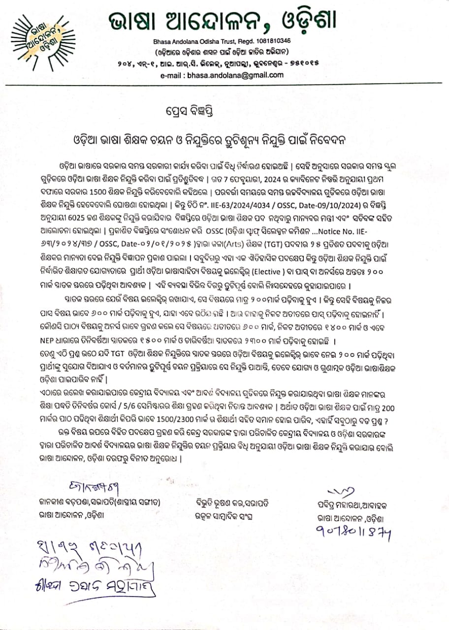 ଆଜି ଓଡ଼ିଆ ଭାଷା ଶିକ୍ଷକ ଚୟନ ଓ ନିଯୁକ୍ତିରେ ତ୍ରୁଟିଶୂନ୍ୟ ନିଯୁକ୍ତି ପାଇଁ ଭାଷା ଆନ୍ଦୋଳନ ପକ୍ଷରୁ ରାଜ୍ୟ ସରକାରଙ୍କୁ ନିବେଦନ କରାଯାଇଛି । ଭାଷା ଆନ୍ଦୋଳନ ତରଫରୁ କୁହାଯାଇଛି ଓଡ଼ିଆ ଭାଷାରେ ସରକାର ସମସ୍ତ ସରକାରୀ କାର୍ଯ୍ୟ କରିବା ପାଇଁ ବିଧି ନିର୍ଦ୍ଧାରଣ ହୋଇଅଛି । ସେହି ଅନୁସାରେ ସରକାର ସମସ୍ତ ସ୍କୁଲ ଗୁଡ଼ିକରେ ଓଡ଼ିଆ ଭାଷା ଶିକ୍ଷକ ନିଯୁକ୍ତି କରିବା ପାଇଁ ପ୍ରତିଶ୍ରୁତିବଦ୍ଧ । ଗତ ୭ ଫେବୃୟାରୀ, ୨୦୨୪ ର କ୍ୟାବିନେଟ ନିଷ୍ପତ୍ତି ଅନୁଯାୟୀ ପ୍ରଥମ ଦଫାରେ ସରକାର ୧୫୦୦ ଶିକ୍ଷକ ନିଯୁକ୍ତି କରିବେ ବୋଲି କହିଥିଲେ । ପରବର୍ତ୍ତୀ ସମୟରେ ସମସ୍ତ ଉଚ୍ଚବିଦ୍ୟାଳୟ ଗୁଡିକରେ ଓଡ଼ିଆ ଭାଷା ଶିକ୍ଷକ ନିଯୁକ୍ତି ହେବେବୋଲି ଘୋଷଣା ହୋଇଥିଲା । କିନ୍ତୁ ଚିଠି ନଂ. IIE-63/2024/4034 / OSSC, ୯ ଅକ୍ଟୋବର ୨୦୨୪ର ବିଜ୍ଞପ୍ତି ଅନୁଯାୟୀ ୬୦୨୫ ଜଣ ଶିକ୍ଷକଙ୍କୁ ନିଯୁକ୍ତି କରାଯିବାର ବିଜ୍ଞପ୍ତିରେ ଓଡ଼ିଆ ଭାଷା ଶିକ୍ଷକ ପଦ ନଥିବାରୁ ମାନ୍ୟବର ମନ୍ତ୍ରୀ ଏବଂ ସଚିବଙ୍କ ସହିତ ଆଲୋଚନା ହୋଇଥିଲା । ଏହାପରେ ପ୍ରକାଶିତ ବିଜ୍ଞପ୍ତିରେ ସଂଶୋଧନ କରି ଓଡ଼ିଶା ସ୍ଟାଫ୍ ସିଲେକ୍ସନ କମିଶ Notice No. IIE-୬୩/୨୦୨୪/୩୭ / OSSC, ୨ ଜାନୁଆରୀ ୨୦୨୫ରେ କଳା ଶିକ୍ଷକ (TGT) ପଦବୀର ୨୫ ପ୍ରତିଶତ ପଦବୀକୁ ଓଡ଼ିଆ ଶିକ୍ଷକର ମାନ୍ୟତା ଦେଇ ନିଯୁକ୍ତି ବିଜ୍ଞାପନ ପ୍ରକାଶ ପାଇଲା । ସବୁଦିଗରୁ ଏହା ଏକ ଐତିହାସିକ ପଦକ୍ଷେପ କିନ୍ତୁ ଓଡ଼ିଆ ଶିକ୍ଷକ ନିଯୁକ୍ତି ପାଇଁ ନିର୍ଦ୍ଧାରିତ ଶିକ୍ଷାଗତ ଯୋଗ୍ୟତାରେ ପ୍ରାର୍ଥୀ ଓଡ଼ିଆ ଭାଷାସାହିତ୍ୟ ବିଷୟକୁ ଇଲେକ୍ଟିଭ୍ (Elective ) ବା ପାସ୍ ବା ଅନର୍ସରେ ଅନ୍ତତଃ ୨୦୦ ମାର୍କ ସ୍ନାତକ ସ୍ତରରେ ପଢ଼ିଥିବା ଆବଶ୍ୟକ । ଏହି ବ୍ୟବସ୍ଥା ବିଭିନ୍ନ ଦିଗରୁ ତ୍ରୁଟିପୂର୍ଣ୍ଣ ବୋଲି ନିଃସନ୍ଦେହରେ କୁହାଯାଇପାରେ । ସ୍ନାତକ ସ୍ତରରେ ଯେଉଁ ବିଷୟ ଇଲେକ୍ଟିଭ୍ ରଖାଯାଏ, ସେ ବିଷୟରେ ମାତ୍ର ୨୦୦ମାର୍କ ପଢ଼ିବାକୁ ହୁଏ । କିନ୍ତୁ ସେହି ବିଷୟକୁ ନିଜର ପାସ ବିଷୟ ଭାବେ ୬୦୦ ମାର୍କ ପଢ଼ିବାକୁ ହୁଏ, ଯାହା ଏବେ ଉଠିଯାଇଛି । ଆଉ କାହାକୁ ନିକଟ ଅତୀତରେ ପାସ୍ ପଢ଼ିବାକୁ ହୋଇନାହିଁ । କୌଣସି ପାଠ୍ୟ ବିଷୟକୁ ଅନର୍ସ ଭାବେ ଗ୍ରହଣ କଲେ ସେ ବିଷୟରେ ଅତୀତରେ ୬୦୦ ମାର୍କ, ନିକଟ ଅତୀତରେ ୧୪୦୦ ମାର୍କ ଓ ଏବେ NEP ଧାରାରେ ତିନିବର୍ଷିଆ ସ୍ନାତକରେ ୧୫୦୦ ମାର୍କ ଓ ଚାରିବର୍ଷିଆ ସ୍ନାତକରେ ୨୩୦୦ ମାର୍କ ପଢ଼ିବାକୁ ହୋଇଛି । ତେଣୁ ଏଠି ପ୍ରଶ୍ନ ଉଠେ ଯଦି TGT ଓଡ଼ିଆ ଶିକ୍ଷକ ନିଯୁକ୍ତିରେ ସ୍ନାତକ ସ୍ତରରେ ଓଡ଼ିଆ ବିଷୟକୁ ଇଲେକ୍ଟିଭ୍ ଭାବେ ନେଇ ୨୦୦ ମାର୍କ ପଢ଼ିଥିବା ପ୍ରାର୍ଥୀଙ୍କୁ ସୁଯୋଗ ଦିଆଯାଏ ଓ ବର୍ତମାନର ତ୍ରୁଟିପୂର୍ଣ୍ଣ ଚୟନ ପ୍ରକ୍ରିୟାରେ ସେ ନିଯୁକ୍ତି ପାଆନ୍ତି, ତେବେ ଯୋଗ୍ୟ ଓ ଗୁଣାତ୍ମକ ଓଡ଼ିଆ ଭାଷାଶିକ୍ଷକ ଓଡ଼ିଶା ପାଇପାରିବ ନାହିଁ । ଏଠାରେ ଉଲ୍ଲେଖ କରାଯାଇପାରେ କେନ୍ଦ୍ରୀୟ ବିଦ୍ୟାଳୟ ଏବଂ ଆଦର୍ଶ ବିଦ୍ୟାଳୟ ଗୁଡିକରେ ନିଯୁକ୍ତ କରାଯାଉଥିବା ଭାଷା ଶିକ୍ଷକ ମାନଙ୍କର ଶିକ୍ଷା ପଦ୍ଧତି ତିନିବର୍ଷର କୋର୍ସ / ୫/୬ ସେମିଷ୍ଟାରର ଶିକ୍ଷା ଗ୍ରହଣ କରିଥିବା ନିତାନ୍ତ ଆବଶ୍ୟକ । ଅର୍ଥାତ ଓଡ଼ିଆ ଭାଷା ଶିକ୍ଷକ ପାଇଁ ମାତ୍ର ୨୦୦ ମାର୍କର ପାଠ ପଢିଥିବା ଶିକ୍ଷାର୍ଥୀ କିପରି ଭାବେ ୧୫୦୦/୨୩୦୦ ମାର୍କ ର ଶିକ୍ଷାର୍ଥୀ ସହିତ ସମାନ ହୋଇ ପାରିବ, ଏହାହିଁ ସବୁଠାରୁ ବଡ ପ୍ରଶ୍ନ ? ଉକ୍ତ ବିଷୟ ଉପରେ ବିହିତ ପ
