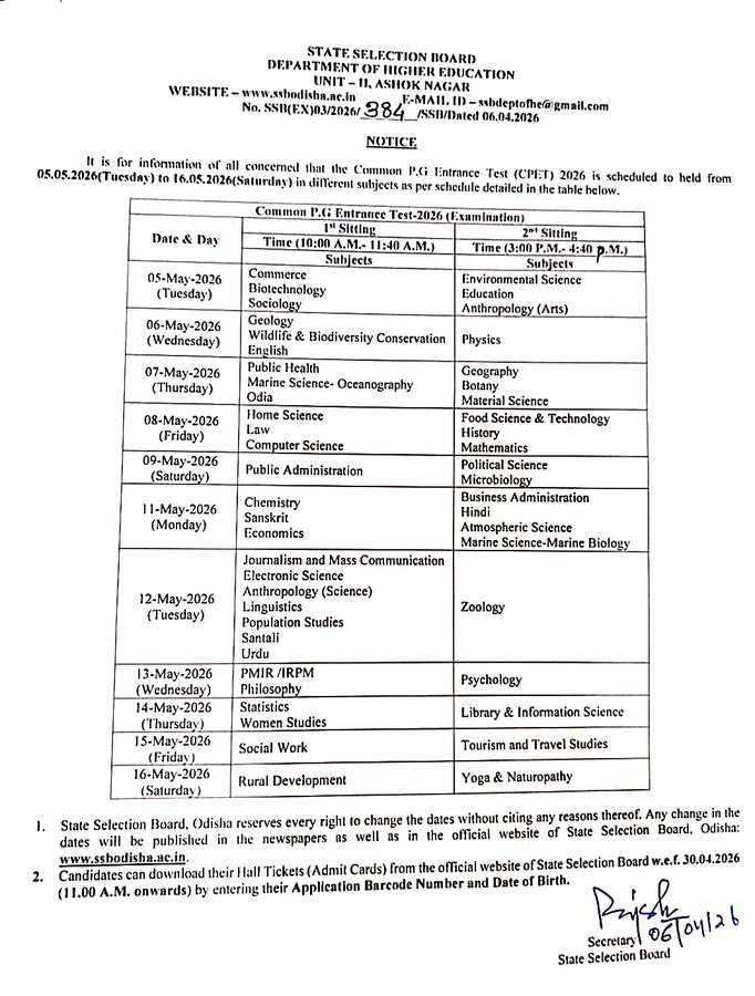 ରାଜ୍ୟ ଚୟନ ବୋର୍ଡ (ଏସଏସବି) ସାଧାରଣ ପିଜି ପ୍ରବେଶିକା ପରୀକ୍ଷା (CPET) ୨୦୨୬ ପାଇଁ କାର୍ଯ୍ୟସୂଚୀ ଘୋଷଣା କରିଛି। ଏହି ପରୀକ୍ଷା ମେ’ ୫ରୁ ୧୬ ପର୍ଯ୍ୟନ୍ତ ରାଜ୍ୟ ସାରା ଅନୁଷ୍ଠିତ ହେବ। ୫୦ଟି ସ୍ନାତକୋତ୍ତର ବିଷୟ ପାଇଁ ହେବ ପ୍ରବେଶିକା ପରୀକ୍ଷା। ୨୦୨୬-୨୭ ଶିକ୍ଷାବର୍ଷ ପାଇଁ, ରାଜ୍ୟର ବିଭିନ୍ନ ପ୍ରତିଷ୍ଠାନରେ ୩୧,୯୧୫ ସ୍ନାତକୋତ୍ତର ଆସନରେ ପ୍ରବେଶ ପାଇଁ ମୋଟ ୫୮,୭୦୮ ଜଣ ପ୍ରାର୍ଥୀ ଆବେଦନ କରିଛନ୍ତି।